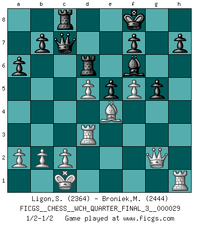 Last move : 1/2-1/2 2025 April 24 11:2:42 [Event "FICGS__CHESS__WCH_QUARTER_FINAL_3__000029"] [Site "FICGS"] [Date "2025.02.02"] [Round "4"] [White "Ligon,Scott"] [Black "Broniek,Mariusz Maciej"] [Result "1/2-1/2"] [WhiteElo "2364"] [BlackElo "2444"] 1.e4 c5 2.Nf3 d6 3.d4 cxd4 4.Nxd4 Nf6 5.Nc3 a6 6.h3 e5 7.Nb3 Be6 8.Be3 Be7 9.f4 exf4 10.Bxf4 Nc6 11.Qe2 Nd7 12.O-O-O Nce5 13.g4 Rc8 14.Qd2 O-O 15.Nd4 Nb6 16.Nf5 Bxf5 17.gxf5 Re8 18.Bxe5 dxe5 19.Qg2 Qc7 20.Rg1 g6 21.h4 Red8 22.Nd5 Nxd5 23.exd5 Bxh4 24.Bd3 Rd6 25.Rh1 Bf6 26.Be4 g5 27.Rd3 Kg7 28.Qh2 Kf8 29.Qg2 Kg7 30.Qh2 Kf8 31.Qg2 1/2-1/2 Follow this game move after move (download)By this measure (on the gap between Fischer & his contemporaries), I consider him the greatest world champion. (Garry Kasparov) Wir können eben der zündenden Macht des Opfers nicht wiederstehen, denn die Begeisterung für das Opfer liegt in der Natur des Menschen. (Rudolf Spielmann) El Ajedrez es un juego terrible. Si no dominas el centro, tu oponente tiene una posición mas libre. Si tu tienes el centro, entonces realmente tienes algo de que preocuparte. (Siegbert Tarrasch) À la honte des hommes, on sait que les lois du jeu sont les seules qui soient partout justes, claires, inviolables et exécutées. Pourquoi l'Indien qui a donné les règles du jeu d'échecs est-il obéi de bon gré dans toute la terre, et que les décrétales des papes, par exemple, sont aujourd'hui un objet d'horreur et de mépris ? C'est que l'inventeur des échecs combina tout avec justesse pour la satisfaction des joueurs, et que les papes, dans leurs décrétales, n'eurent en vue que leur seul avantage. L'Indien voulut exercer également l'esprit des hommes et leur donner du plaisir; les papes ont voulu abrutir l'esprit des hommes. Voltaire (Dictionnaire philosophique / Garnier 1967) Animated gif is worth one mega-word. (Unknown)