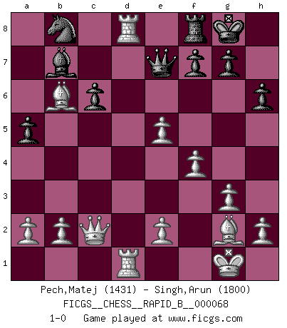 Last move : 1-0 2007 December 18 14:32:23 [Event "FICGS__CHESS__RAPID_B__000068"] [Site "FICGS"] [Date "2007.09.26"] [Round "1"] [White "Pech,Matej"] [Black "Singh,Arun"] [Result "1-0"] [WhiteElo "1431"] [BlackElo "1800"] 1.d4 Nf6 2.c4 e6 3.Nf3 b6 4.g3 Bb7 5.Bg2 Be7 6.O-O d5 7.Ne5 Nbd7 8.cxd5 exd5 9.Qa4 O-O 10.Nc3 Nxe5 11.dxe5 Nd7 12.Nxd5 c6 13.Nxe7+ Qxe7 14.f4 Qe6 15.Bd2 Nc5 16.Qc2 a5 17.Be3 Nd7 18.Rfd1 Rad8 19.Rd6 Qe7 20.Rad1 Nb8 21.Bxb6 h6 22.Rxd8 1-0 Queen's Indian : Old Main line, 6.O-O Kingside Castling by player White (move 6) Kingside Castling by player Black (move 9) Player White won this chess game. Follow this game move after move (download)What would Chess be without silly mistakes ? (Kurt Richter) Die Jungen erwarten, dass Opa einfach umfällt. Dann aber kann Opa fünf Stunden lang Schach spielen und die jungen Gegner an die Wand drücken. (Viktor Kortschnoi) El jugador de combinación piensa hacia adelante; comienza de la posición dada y trabaja las movidas contundentes en su mente. (Emanuel Lasker) Vous n'êtes pas toujours obligé de jouer le meilleur coup. Un coup doit être actif, entreprenant, correct et beau ! (David Bronstein) Nothing is more important for teaching us to understand the concepts we have than constructing fictitious ones. (Ludwig Wittgenstein)