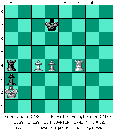 Last move : 1/2-1/2 2025 June 11 8:37:54 [Event "FICGS__CHESS__WCH_QUARTER_FINAL_4__000029"] [Site "FICGS"] [Date "2025.02.02"] [Round "4"] [White "Sorbi,Luca"] [Black "Bernal Varela,Nelson"] [Result "1/2-1/2"] [WhiteElo "2332"] [BlackElo "2450"] 1.e4 c5 2.Nf3 e6 3.d4 cxd4 4.Nxd4 Nc6 5.Nc3 a6 6.Be3 Nf6 7.a3 b5 8.Nxc6 dxc6 9.Qxd8+ Kxd8 10.O-O-O Kc7 11.Bf4+ Kb6 12.a4 Kb7 13.Be2 Bc5 14.e5 Nd5 15.Bd2 Bd4 16.f4 Nxc3 17.bxc3 Bb6 18.c4 bxa4 19.Bb4 c5 20.Bf3+ Ka7 21.Ba3 Rb8 22.Bc6 Bb7 23.Rd7 Rhc8 24.Bxa4 Rc7 25.Rhd1 Rbc8 26.g3 h5 27.c3 Bf3 28.R1d2 Kb7 29.Rf2 Be4 30.Rd1 Bc6 31.Bxc6+ Rxc6 32.Rfd2 Re8 33.Rb2 Kc8 34.Rbd2 Rd8 35.Rxd8+ Bxd8 36.Kc2 Bc7 37.Kb3 f6 38.exf6 gxf6 39.f5 exf5 40.Rd5 Rb6+ 41.Kc2 Re6 42.Kd3 h4 43.gxh4 Re4 44.Rxf5 Rxh4 45.Bxc5 Be5 46.Bd4 Kd7 47.Rf1 Rh3+ 48.Kd2 Rxh2+ 49.Kd3 Rh3+ 50.Kc2 Rh4 51.Kd3 Rh3+ 52.Kc2 Rh4 53.Rd1 Bxd4 54.cxd4 a5 55.Kd3 a4 56.Kc3 a3 57.Rd2 Rh8 58.Kb3 Ra8 59.Rf2 f5 60.Ka2 Ra4 61.Rc2 Ke6 62.Re2+ Kd7 63.Rf2 f4 64.Rxf4 1/2-1/2 Follow this game move after move (download)When the Chess game is over, the Pawn and the King go back to the same box. (Irish saying) Frage: Gibt es etwas was Sie mehr lieben als Autobahnen ohne Tempobegrenzungen? - Antwort: Deutsche Frauen ohne Tempobegrenzungen. (Loek van Wely) Bobby es el jugador de Ajedrez mas fino que este país jamás haya producido. Su memoria para las movidas, su brillantez en soñar combinaciones y su feróz determinación por la victoria son algo extraño. (John Collins) Mais n'est-ce pas déjà le limiter injurieusement que d'appeler les échecs un jeu? N'est-ce pas aussi une science, un art, ou quelque chose qui, comme le cercueil de Mahomet entre ciel et terre, est suspendu entre l'un et l'autre, et qui réunit un nombre incroyable de contraires ? (Stefan Zweig) But they are useless. They can only give you answers. (Pablo Picasso, about computers)