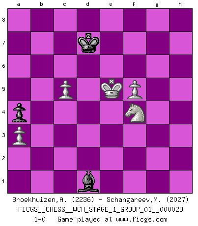 Last move : 1-0 2025 June 9 4:47:52 [Event "FICGS__CHESS__WCH_STAGE_1_GROUP_01__000029"] [Site "FICGS"] [Date "2025.02.02"] [Round "1"] [White "Broekhuizen,A. T. S."] [Black "Schangareev,Mirzian"] [Result "1-0"] [WhiteElo "2236"] [BlackElo "2027"] 1.e4 e5 2.Nf3 Nc6 3.Bb5 Nf6 4.O-O Nxe4 5.d4 Nd6 6.Bxc6 dxc6 7.dxe5 Nf5 8.Qxd8+ Kxd8 9.Nc3 Ke8 10.h3 Be7 11.Bg5 Bxg5 12.Nxg5 h6 13.Nf3 Bd7 14.g4 Ne7 15.Kg2 Rd8 16.Kg3 c5 17.Rad1 Bc6 18.Rxd8+ Kxd8 19.Nh4 g6 20.f3 Kd7 21.Ng2 Rd8 22.h4 Kc8 23.Ne3 Rd2 24.h5 gxh5 25.gxh5 Bd7 26.Rf2 Nf5+ 27.Nxf5 Rxf2 28.Ne7+ Kd8 29.Kxf2 Kxe7 30.Ne4 b6 31.Ke3 a6 32.Kf4 Kf8 33.Ng3 Be6 34.a3 Kg8 35.Ke4 Bd7 36.Nf5 Kh7 37.Ne3 Bc6+ 38.Nd5 Kg7 39.c4 b5 40.Kf4 bxc4 41.Nxc7 a5 42.Na6 Be8 43.Nxc5 f6 44.Ne6+ Kf7 45.Nd4 fxe5+ 46.Kxe5 Kf8 47.Nf5 a4 48.Nxh6 Bxh5 49.f4 Be2 50.Nf5 Bh5 51.Kd4 Be2 52.Ne3 c3 53.bxc3 Ke7 54.c4 Kd7 55.f5 Kc6 56.c5 Kd7 57.Nd5 Bf3 58.Ke5 Bd1 59.Nf4 1-0 Follow this game move after move (download)My opponents make good moves too. Sometimes I don't take these things into consideration. (Bobby Fischer) Es ist im Leben wie im Schachspiel. Wir entwerfen einen Plan, dieser bleibt jedoch bedingt durch das, was im Schachspiel dem Gegner, im Leben dem Schicksal zu tun belieben wird. (Arthur Schopenhauer) Tu sabes, camarada Pachman, no disfruto el ser un Ministro, preferería jugar al Ajedrez como tu. (Che Guevara) La vie est comme un jeu d'échecs : nous esquissons un plan, mais celui-ci est tributaire de ce que daignent faire l'adversaire aux échecs et le destin dans la vie. (Arthur Schopenhauer) All battles are fought by scared men who'd rather be someplace else. (John Wayne in the movie In harm's way)