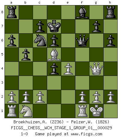Last move : 1-0 2025 March 19 15:12:5 [Event "FICGS__CHESS__WCH_STAGE_1_GROUP_01__000029"] [Site "FICGS"] [Date "2025.02.02"] [Round "1"] [White "Broekhuizen,A. T. S."] [Black "Pelzer,Willi"] [Result "1-0"] [WhiteElo "2236"] [BlackElo "1826"] 1.e4 e5 2.Nf3 Nc6 3.Bb5 a6 4.Ba4 b5 5.Bb3 Nf6 6.d4 exd4 7.O-O d6 8.Ng5 Be6 9.Nxe6 fxe6 10.Bxe6 Qe7 11.Bd5 Kd7 12.Bg5 h6 13.Bxf6 Qxf6 14.Qg4+ 1-0 Follow this game move after move (download)Adequate compensation for a sacrifice is having a sound combination leading to a winning position; adequate compensation for a blunder is having your opponent snatch defeat from the jaws of victory. (Bruce A. Moon) Schach ist gnadenlos. Du mußt bereit sein zu töten. (Nigel Short) La captura del Rey enemigo es la finalidad pero no el primer objetivo de la partida. (William Steinitz) Vous n'êtes pas toujours obligé de jouer le meilleur coup. Un coup doit être actif, entreprenant, correct et beau ! (David Bronstein) When you've done things right people won't know you've done anything at all. (Futurama)