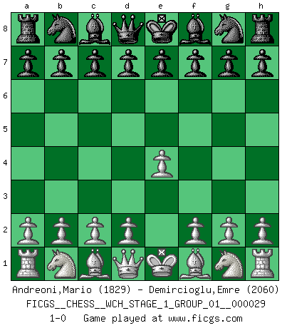 Last move : 1-0 2025 March 4 23:56:48 [Event "FICGS__CHESS__WCH_STAGE_1_GROUP_01__000029"] [Site "FICGS"] [Date "2025.02.02"] [Round "1"] [White "Andreoni,Mario"] [Black "Demircioglu,Emre"] [Result "1-0"] [WhiteElo "1829"] [BlackElo "2060"] 1.e4 1-0 This chess game has been lost on time (started : 2025.02.02 2:54:6) Follow this game move after move (download)Openings teach you openings. Endgames teach you chess ! (Stephan Gerzadowicz) Es ist besser die Steine des Gegners zu opfern. (Savielly Grigorievitsch Tartakower) Si el Ajedrez es una ciencia, es la mas inexacta. Si el Ajedrez es un arte, es demasiado inexacto para ser visto como tal. Si el Ajedrez es un deporte, es demasiado esotérico. Si el Ajedrez es un juego, es demasiado exigente para ser solo un juego. Si el Ajedrez es una aventura, es una muy demandante. Si el Ajedrez es una pasión, es una muy gratificante. Si el Ajedrez es la vida, es una muy triste. (Anónimo) Shah mat. Le roi est mort. Cri de fierté d'un joueur venant de terrasser son adversaire, courtoisement, sans effusion de sang. Real knowledge is to know the extent of one's ignorance. (Confucius)
