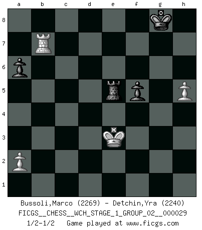 Last move : 1/2-1/2 2025 March 8 21:21:48 [Event "FICGS__CHESS__WCH_STAGE_1_GROUP_02__000029"] [Site "FICGS"] [Date "2025.02.02"] [Round "1"] [White "Bussoli,Marco"] [Black "Detchin,Yra"] [Result "1/2-1/2"] [WhiteElo "2269"] [BlackElo "2240"] 1.d4 Nf6 2.c4 g6 3.Nc3 d5 4.cxd5 Nxd5 5.Nf3 Bg7 6.e4 Nxc3 7.bxc3 c5 8.Be3 Qa5 9.Qd2 Nc6 10.Rb1 a6 11.Rc1 cxd4 12.cxd4 Qxd2+ 13.Kxd2 e6 14.Bd3 O-O 15.h4 h6 16.e5 Rd8 17.h5 g5 18.Nxg5 Nxd4 19.Ne4 Bxe5 20.Bxh6 f5 21.Nc5 b6 22.Bg5 Rd6 23.f4 Bh8 24.Nb3 Nc6 25.Rh3 Nb4 26.Be7 Rxd3+ 27.Rxd3 Nxd3 28.Kxd3 Bb7 29.Rc7 Bxg2 30.Nd4 Be4+ 31.Ke3 e5 32.Nc6 Bxc6 33.Rxc6 Kf7 34.Bd6 Re8 35.Rxb6 Re6 36.Rb7+ Kg8 37.fxe5 Bxe5 38.Bxe5 Rxe5+ 1/2-1/2 Follow this game move after move (download)Not only will I predict his triumph over Botvinnik, but I'll go further and say that he'll probably be the greatest Chess player that ever lived. (John Collins) Habe Mut, dich deines eigenen Verstandes zu bedienen. (Immanuel Kant) ¿Que sería del Ajedrez sin errores graciosos?. (Kurt Richter) Le moment que je préfère le plus dans une rencontre, c'est celui où je sens que la personnalité de l'adversaire se brise. (Robert Fischer) Indecision is the key to flexibility. (Unknown)