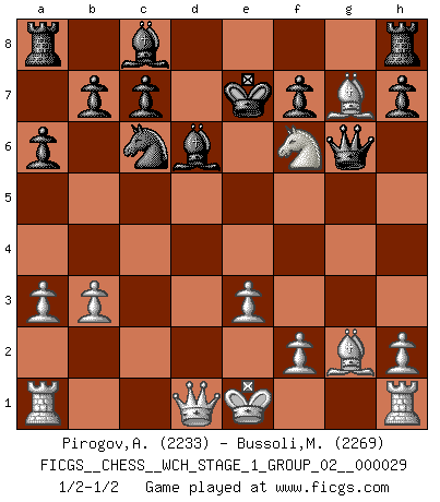 Last move : 1/2-1/2 2025 March 3 16:13:34 [Event "FICGS__CHESS__WCH_STAGE_1_GROUP_02__000029"] [Site "FICGS"] [Date "2025.02.02"] [Round "1"] [White "Pirogov,Andrey Mikhaylovich"] [Black "Bussoli,Marco"] [Result "1/2-1/2"] [WhiteElo "2233"] [BlackElo "2269"] 1.b3 e5 2.Bb2 Nc6 3.e3 a6 4.c4 d5 5.cxd5 Qxd5 6.Nc3 Qe6 7.Nf3 Nf6 8.a3 e4 9.d4 exf3 10.d5 Nxd5 11.Nxd5 Bd6 12.Bxg7 fxg2 13.Bxg2 Qg6 14.Nf6+ Ke7 15.Nd5+ Ke8 16.Nf6+ Ke7 1/2-1/2 Follow this game move after move (download)In a gambit you give up a Pawn for the sake of getting a lost game. (Samuel Standige Boden) Ich trinke, ich rauche, ich spiele, ich liebe Frauen aber Fernschach ist ein Laster, das ich nicht habe. (Mikhail Nekhemyevich Tal) Para mi, el Ajedrez es la vida y cada partida es como una nueva vida. Todo jugador de Ajedrez suele vivir muchas vidas durante su vida. (Eduard Gufeld) Des points faibles ou des trous dans la position de l'adversaire doivent être occupés par des pièces et non pas par des pions. (Siegbert Tarrasch) The difference between stupidity and genius is that genius has its limits. (Murphy)