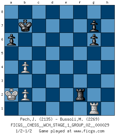 Last move : 1/2-1/2 2025 May 29 0:53:55 [Event "FICGS__CHESS__WCH_STAGE_1_GROUP_02__000029"] [Site "FICGS"] [Date "2025.02.02"] [Round "1"] [White "Pech,Jaroslav senior"] [Black "Bussoli,Marco"] [Result "1/2-1/2"] [WhiteElo "2135"] [BlackElo "2269"] 1.e4 c5 2.Nf3 d6 3.d4 cxd4 4.Nxd4 Nf6 5.Nc3 a6 6.Be3 e6 7.f3 b5 8.Qd2 Nbd7 9.g4 b4 10.Nce2 h6 11.O-O-O Qc7 12.h4 d5 13.Bf4 e5 14.Bh2 dxe4 15.g5 hxg5 16.hxg5 Rxh2 17.Rxh2 exd4 18.Rh4 Ng4 19.Rxg4 Nc5 20.Rh4 d3 21.Nd4 Bb7 22.Rh8 O-O-O 23.g6 fxg6 24.Kb1 dxc2+ 25.Qxc2 exf3 26.Ka1 Bd5 27.Bc4 Bxc4 28.Qxc4 f2 29.Rf1 Qf4 30.Rxf8 Qxf8 31.Ne6 Qe7 32.Qxc5+ Qxc5 33.Nxc5 Rd5 34.Ne4 Kb8 35.a3 Re5 36.Nxf2 Rf5 37.axb4 Kb7 38.Ka2 Rf6 39.Rg1 Rxf2 1/2-1/2 Follow this game move after move (download)A big shock; the best chess player in history has passed away. (Lajos Portisch, about Bobby Fischer's death) In Buenos Aires ist es nicht mein vorrangiges Ziel ein starkes Turnier zu organisieren, sondern ein Turnier für Gentlemen. Ich würde nie Kamsky einladen. Ich mag keine Probleme. (Miguel Najdorf) Nada excita más a Grandes Maestros aburridos que una novedad teórica. (Dominic Lawson) Karpov est une pièce de musée. (Garry Kasparov) Fame, I have already. Now I need the money. (an elderly Steinitz)