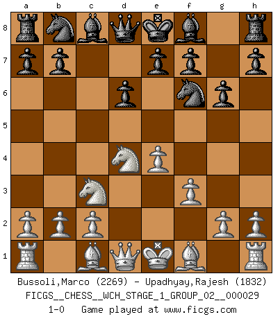 Last move : 1-0 2025 March 13 14:51:7 [Event "FICGS__CHESS__WCH_STAGE_1_GROUP_02__000029"] [Site "FICGS"] [Date "2025.02.02"] [Round "1"] [White "Bussoli,Marco"] [Black "Upadhyay,Rajesh"] [Result "1-0"] [WhiteElo "2269"] [BlackElo "1832"] 1.e4 c5 2.Nf3 d6 3.d4 cxd4 4.Nxd4 Nf6 5.Nc3 g6 6.f3 1-0 This chess game has been lost on time (started : 2025.02.02 2:54:11) Follow this game move after move (download)Your body has to be in top condition. Your Chess deteriorates as your body does. You can't separate body from mind. (Bobby Fischer) Der Bart als Geschlechtszeichen mitten im Gesicht ist obszön. Daher gefällt er den Weibern. [Zugegeben, kein Schachzitat, aber unglaublich originell] (Arthur Schopenhauer) Con el tiempo, empecé a progresar en partidas decisivas. Tal vez porque me di cuenta de una simple verdad: no solo estaba yo nervioso sino también mi oponente. (Mikhail Tal) Les Echecs ont trois composantes : le temps, l'espace et le matériel en dernier. (Mikhail Tal) Luck is what you have left over after you give 100 percent. (Langston Coleman)