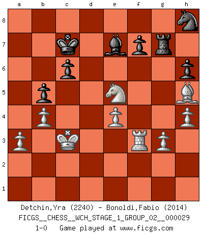 Last move : 1-0 2025 April 17 21:10:1 [Event "FICGS__CHESS__WCH_STAGE_1_GROUP_02__000029"] [Site "FICGS"] [Date "2025.02.02"] [Round "1"] [White "Detchin,Yra"] [Black "Bonoldi,Fabio"] [Result "1-0"] [WhiteElo "2240"] [BlackElo "2014"] 1.d4 g6 2.e4 Bg7 3.c4 d6 4.Nc3 Nd7 5.Nf3 e5 6.Be2 Ne7 7.dxe5 Nxe5 8.Nxe5 dxe5 9.Qxd8+ Kxd8 10.Bg5 c6 11.O-O-O Ke8 12.Rd6 Be6 13.Rhd1 h6 14.Bh4 g5 15.Bh5 gxh4 16.Rxe6 Rd8 17.c5 Rxd1+ 18.Nxd1 Rg8 19.b4 Bf8 20.Rf6 Ng6 21.g3 hxg3 22.fxg3 Be7 23.Rf1 b6 24.cxb6 axb6 25.a3 b5 26.Kb2 Rg7 27.Ne3 Kd7 28.Ng4 Kc7 29.Kc3 Kb6 30.Rf3 Kc7 31.h4 Nh8 32.Nxe5 1-0 Follow this game move after move (download)It is difficult to play against Einstein's theory --on his first loss to Fischer. (Mikhail Tal) Garry Kasparov war erst in der Großmeister-Organisation GMA, dann in der Profischach-Vereinigung PCA, zum Schluss kehrte er wieder in den Schoß der FIDE zurück. Aber gut, manche Leute sind flexibel (Viswanathan Anand) De todos mis libros Rusos, la defensa contiene y difunde el 'calor' mas grande que pudiese verse extraño al observar lo supremamente abstracto que el Ajedrez supuestamente es. (Vladimir Nabokov) Soyez une menace à chaque fois que vous vous asseyez pour jouer. (Ken Smith) Life is painting a picture, not doing a sum. (Oliver Wendell Holmes, Jr.)