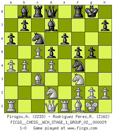 Last move : 1-0 2025 April 9 12:18:33 [Event "FICGS__CHESS__WCH_STAGE_1_GROUP_02__000029"] [Site "FICGS"] [Date "2025.02.02"] [Round "1"] [White "Pirogov,Andrey Mikhaylovich"] [Black "Rodriguez Perez,Rene"] [Result "1-0"] [WhiteElo "2233"] [BlackElo "2162"] 1.b3 d5 2.Nf3 Nf6 3.e3 c5 4.Bb2 Nc6 5.Bb5 Bd7 6.O-O e6 7.d4 cxd4 8.exd4 Bd6 9.Bd3 O-O 10.c4 Rc8 11.Re1 a6 12.c5 Bb8 13.Nbd2 Nh5 14.Bc3 f5 15.b4 g5 16.a4 Nf4 17.Bf1 1-0 This chess game has been lost on time (started : 2025.02.02 2:54:11) Follow this game move after move (download)Fischer is under obligation to nobody. (Joseph Platz) Wenn Schach ein enormer Dschungel ist, der seine Myriaden von Geheimnissen nicht preisgeben will, dann sind Computer die Kettensägen einer gewaltigen ökologisch unsensiblen Nutzholzfirma. (Nigel Short) Yo nunca en mi vida he jugado la Defensa Francesa, que viene siendo la más aburrida de todas las Aperturas. (Wilhelm Steinitz) Fischer est le meilleur joueur du monde et Karpov n'est qu'un joueur de bistrot. (Garry Kasparov, agé de 16 ans) Nowadays, anyone who cannot speak English and is incapable of using the Internet is regarded as backward. (Al-Waleed bin Talal)