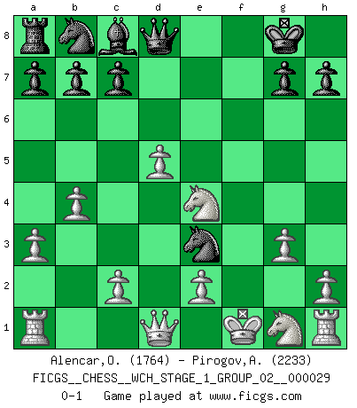 Last move : 0-1 2025 February 28 9:56:1 [Event "FICGS__CHESS__WCH_STAGE_1_GROUP_02__000029"] [Site "FICGS"] [Date "2025.02.02"] [Round "1"] [White "Alencar,Ofir"] [Black "Pirogov,Andrey Mikhaylovich"] [Result "0-1"] [WhiteElo "1764"] [BlackElo "2233"] 1.d4 Nf6 2.d5 e6 3.dxe6 fxe6 4.Nc3 Bb4 5.Bd2 O-O 6.a3 Ba5 7.b4 Bb6 8.Be3 Bxe3 9.fxe3 e5 10.e4 d5 11.exd5 e4 12.g3 Ng4 13.Nxe4 Rxf1+ 14.Kxf1 Ne3+ 0-1 Follow this game move after move (download)You cannot play at Chess if you are kind-hearted. (French Proverb) Ich liebe den Moment, wenn ich das Ego meines Gegenüber breche. (Robert James Fischer) El Ajedrez es una guerra en un tablero. El objetivo es aplastar la mente del oponente. (Bobby Fischer) Que feriez-vous si vous étiez en train de jouer aux échecs et que la fin du monde arrive ? Je continuerais à jouer. (Saint Borromée) SEO proverb : Make your website optimized for human beings, not for search engines.