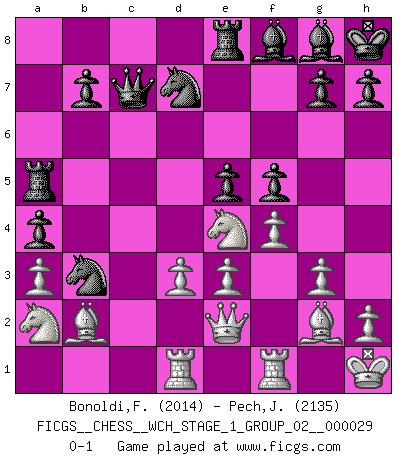 Last move : 0-1 2025 June 10 15:13:12 [Event "FICGS__CHESS__WCH_STAGE_1_GROUP_02__000029"] [Site "FICGS"] [Date "2025.02.02"] [Round "1"] [White "Bonoldi,Fabio"] [Black "Pech,Jaroslav senior"] [Result "0-1"] [WhiteElo "2014"] [BlackElo "2135"] 1.c4 e5 2.g3 Nf6 3.Bg2 d5 4.cxd5 Nxd5 5.Nc3 Nb6 6.Nf3 Nc6 7.O-O Be7 8.a3 O-O 9.d3 Be6 10.b4 a5 11.b5 Nd4 12.Nd2 c6 13.bxc6 Nxc6 14.Rb1 a4 15.Bb2 Ra5 16.Kh1 Re8 17.f4 f6 18.Qe1 Kh8 19.Nf3 Nd7 20.Nd2 Ra6 21.Nde4 Nd4 22.e3 Nb3 23.Qe2 Bg8 24.Bh3 Qc7 25.Rbd1 Ra5 26.Na2 Bf8 27.Bg2 f5 0-1 Follow this game move after move (download)The Pawns are the soul of the game. (Francois Andre Danican Philidor) Über Frauen: Chess is better. (Robert James Fischer) Un entendimiento a fondo de las continuaciones típicas del mate, hace de las combinaciones de sacrificio mas complicadas conducirlas a ellas no solo sin dificultad, sino casi de una manera natural. (Siegbert Tarrasch) Psychologiquement, tu dois avoir confiance en toi même, mais cette confiance doit être basée sur des faits. (Robert Fischer) A bird doesn't sing because it has an answer, it sings because it has a song. (Maya Angelou)