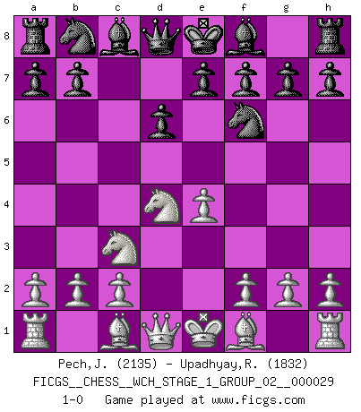 Last move : 1-0 2025 April 13 12:44:12 [Event "FICGS__CHESS__WCH_STAGE_1_GROUP_02__000029"] [Site "FICGS"] [Date "2025.02.02"] [Round "1"] [White "Pech,Jaroslav senior"] [Black "Upadhyay,Rajesh"] [Result "1-0"] [WhiteElo "2135"] [BlackElo "1832"] 1.e4 c5 2.Nf3 d6 3.d4 cxd4 4.Nxd4 Nf6 5.Nc3 1-0 This chess game has been lost on time (started : 2025.02.02 2:54:11) Follow this game move after move (download)Chess makes man wiser and clear-sighted. (Vladimir Putin) Ich verstehe mehr vom Schach als irgendein anderer lebender Meister. (José Raúl Capablanca) El Ajedrez demanda una total concentración. (Bobby Fischer) Si rien de grave n'est détecté lors de l'analyse d'une position, on joue alors le coup. Seconde règle de Blumenfeld. The beginning of wisdom is silence. The second step is listening. (Unknown)