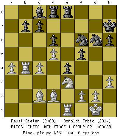 Last move : 1-0 2025 June 10 15:13:21 [Event "FICGS__CHESS__WCH_STAGE_1_GROUP_02__000029"] [Site "FICGS"] [Date "2025.02.02"] [Round "1"] [White "Faust,Dieter"] [Black "Bonoldi,Fabio"] [Result "1-0"] [WhiteElo "2069"] [BlackElo "2014"] 1.d4 g6 2.e4 Bg7 3.c3 d6 4.Nf3 Nf6 5.Bd3 O-O 6.O-O Nc6 7.h3 e5 8.Re1 Re8 9.Na3 h6 10.Nc2 Bd7 11.a4 a5 12.Bd2 Kh7 13.Rb1 Ng8 14.d5 Nce7 15.Ne3 f5 16.exf5 gxf5 17.Nh4 e4 18.Bc2 Bf6 19.Qh5 Bxh4 20.Qxh4 Ng6 21.Qxd8 Raxd8 22.b4 axb4 23.Rxb4 Bc8 24.c4 Nf6 25.Bc3 Rf8 26.a5 Rf7 27.Rb5 Nd7 28.Bd4 Re8 29.Reb1 Nf4 30.Bd1 Kg6 31.Nf1 Rfe7 32.R5b3 Nc5 33.Ra3 Nfd3 34.Ng3 Rg8 35.Be2 f4 36.Nxe4 Rxe4 37.Bxd3 Nxd3 38.Rxd3 f3 39.Rbd1 fxg2 40.Rg3+ Kf7 41.Rxg8 Kxg8 42.Kxg2 1-0 Follow this game move after move (download)Pawns are born free, yet they are everywhere in chains. (Rick Kennedy) Gott hat gewollt, dass ich Champion werde. (Surab Azmajparaschvili) Los Peones son nacidos libres, y aún así, se encuentran encadenados por todos lados. (Rick Kennedy) A chaque perte on perd un peu de soi. (Joël Lautier) I know the human being and fish can coexist peacefully. (George W. Bush, Saginaw sept. 29, 2000)