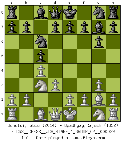 Last move : 1-0 2025 March 24 0:25:27 [Event "FICGS__CHESS__WCH_STAGE_1_GROUP_02__000029"] [Site "FICGS"] [Date "2025.02.02"] [Round "1"] [White "Bonoldi,Fabio"] [Black "Upadhyay,Rajesh"] [Result "1-0"] [WhiteElo "2014"] [BlackElo "1832"] 1.c4 c5 2.g3 Nc6 3.Bg2 g6 4.Nc3 Bg7 5.d3 1-0 This chess game has been lost on time (started : 2025.02.02 2:54:11) Follow this game move after move (download)You know you're going to lose. Even when I was ahead I knew I was going to lose. - On playing against Fischer. (Andrew Soltis) In Buenos Aires ist es nicht mein vorrangiges Ziel ein starkes Turnier zu organisieren, sondern ein Turnier für Gentlemen. Ich würde nie Kamsky einladen. Ich mag keine Probleme. (Miguel Najdorf) No nos podemos resistir a la fascinación de un sacrificio ya que la pasión por los sacrificios es parte de la naturaleza de un jugador de Ajedrez. (Rudolf Spielman) Les échecs sont un jeu terrible. Si vous n'avez pas le centre, votre adversaire a une position plus libre. Par contre, si vous avez le centre, alors vous avez vraiment quelque chose pour laquelle vous inquiéter ! (Siegbert Tarrasch) Wisdom doesn't necessarily come with age. Sometimes age just shows up all by itself. (Tom Wilson)