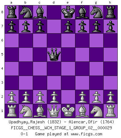 Last move : 0-1 2025 March 6 14:52:44 [Event "FICGS__CHESS__WCH_STAGE_1_GROUP_02__000029"] [Site "FICGS"] [Date "2025.02.02"] [Round "1"] [White "Upadhyay,Rajesh"] [Black "Alencar,Ofir"] [Result "0-1"] [WhiteElo "1832"] [BlackElo "1764"] 1.e4 d5 2.exd5 Qxd5 0-1 This chess game has been lost on time (started : 2025.02.02 2:54:11) Follow this game move after move (download)In the perfect Chess combination as in a first-rate short story, the whole plot and counter-plot should lead up to a striking finale, the interest not being allayed until the very last moment. (Yates and Winter) Ich verachte Kasparow. (Viktor Kortschnoi) El Ajedrez es una guerra en un tablero. El objetivo es aplastar la mente del oponente. (Bobby Fischer) Mon pion favori sur ma case favorite ! Bronstein en parlant d'un coup de pion en h5 quand il avait les Noirs. Men should grow up. - Yeah. And dogs should stop licking themselves. It's not gonna happen. (Gregory House to Dr. Cameron, House M.D.)