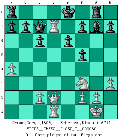 Last move : 1-0 2007 November 2 4:52:28 [Event "FICGS__CHESS__CLASS_C__000060"] [Site "FICGS"] [Date "2007.09.27"] [Round "1"] [White "Gruwe,Gary"] [Black "Behrmann,Klaus"] [Result "1-0"] [WhiteElo "1609"] [BlackElo "1671"] 1.e4 c6 2.Nc3 d5 3.Qf3 dxe4 4.Nxe4 Nd7 5.d4 Ngf6 6.Bd3 Nxe4 7.Qxe4 Nf6 8.Qe5 Ng4 9.Qe2 Qxd4 10.Nf3 Qc5 11.h3 Nf6 12.O-O Bf5 13.Be3 Bxd3 14.Qxd3 Qa5 15.Rfd1 e6 16.Bg5 Qc7 17.Bxf6 gxf6 18.a4 f5 19.Qc3 Rg8 20.Rd3 Bg7 21.Qd2 Bxb2 22.Rd1 Bg7 23.Rd7 1-0 Caro-Kann : GOldman (Spielmann) variation Kingside Castling by player White (move 12) Player White won this chess game. Follow this game move after move (download)You may learn much more from a game you lose than from a game you win. You will have to lose hundreds of games before becoming a good player. (Jose Raul Capablanca) Verschiedene, sehr schätzbare und im Laufe des Lebens nützliche Eigenschaften des Geistes können durch das Schachspiel erworben und gekräftigt werden, so dass sie zu Gewohnheiten werden, die uns nie im Stich lassen. (Benjamin Franklin) El juego de Damas es para vagabundos. (Paul Morphy) Même un GMI sait rarement calculer sur plus de cinq coups une attaque à sacrifices. (Rudolf Spielmann) The only thing that overcomes hard luck is hard work. (Harry Golden)