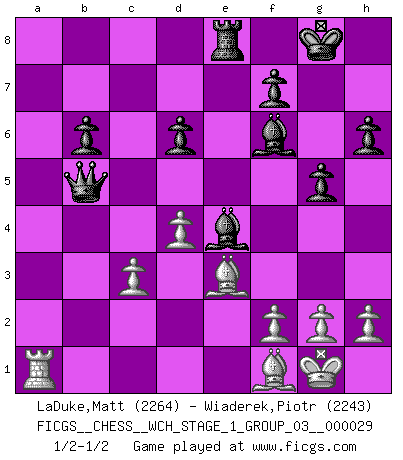 Last move : 1/2-1/2 2025 March 30 23:17:35 [Event "FICGS__CHESS__WCH_STAGE_1_GROUP_03__000029"] [Site "FICGS"] [Date "2025.02.02"] [Round "1"] [White "LaDuke,Matt"] [Black "Wiaderek,Piotr"] [Result "1/2-1/2"] [WhiteElo "2264"] [BlackElo "2243"] 1.e4 e5 2.Nf3 Nc6 3.Bb5 Nf6 4.O-O Nxe4 5.Re1 Nd6 6.Nxe5 Be7 7.Bf1 Nxe5 8.Rxe5 O-O 9.d4 Bf6 10.Re2 b6 11.Re1 Bb7 12.Bf4 Ne4 13.Nd2 Re8 14.Nxe4 Rxe4 15.Rxe4 Bxe4 16.c3 d6 17.Qa4 Qe8 18.Qc4 g5 19.Be3 Qd7 20.a4 Re8 21.a5 h6 22.Qa6 Rb8 23.b4 c6 24.Qe2 Re8 25.axb6 axb6 26.b5 cxb5 27.Qxb5 Qxb5 1/2-1/2 Follow this game move after move (download)A Chess game is divided into three stages: the first, when you hope you have the advantage, the second when you believe you have an advantage, and the third... when you know you're going to lose ! (Savielly Tartakower) Mit Schach schule ich mein Gefühl für Geometrie, was für Tennis und Schach gleichermaßen wichtig ist. (Boris Becker) Cuando le juegas a Fischer, no es una cuestion de si vas a ganar o perder. Es una cuestion de si vas a sobrevivir. (Boris Spassky) L'attaque fait le spectacle, la défense gagne les matchs. (Dicton footballistique) The ego is not master in its own house. (Sigmund Freud)