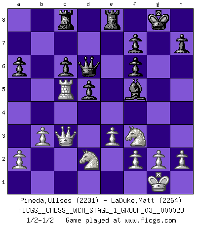 Last move : 1/2-1/2 2025 February 27 14:25:54 [Event "FICGS__CHESS__WCH_STAGE_1_GROUP_03__000029"] [Site "FICGS"] [Date "2025.02.02"] [Round "1"] [White "Pineda,Ulises"] [Black "LaDuke,Matt"] [Result "1/2-1/2"] [WhiteElo "2231"] [BlackElo "2264"] 1.Nf3 d5 2.e3 Nf6 3.c4 e6 4.b3 c5 5.cxd5 exd5 6.Bb5+ Nc6 7.Bb2 Bd6 8.d4 cxd4 9.Nxd4 O-O 10.O-O Bc7 11.Nf3 Re8 12.Nbd2 a6 13.Bxc6 bxc6 14.Rc1 Bd7 15.Rc2 Rc8 16.Qa1 Bf5 17.Bxf6 gxf6 18.Rc5 Bd6 19.Rfc1 Bxc5 20.Rxc5 Qd6 21.Qc3 1/2-1/2 Follow this game move after move (download)I am the best player in the world and I am here to prove it. (Bobby Fischer) Schach ist ein Kampf gegen den Fehler. (Johannes Herrman Zukertort) El Jaque al descubierto es el bombardero del tablero. (Reuben Fine) Une platitude souvent récitée à propos des Echecs est qu'une des choses les plus difficiles à réaliser est de gagner une position gagnante. Cela ne manque pas de sens mais, pour ma part, j'ai toujours trouvé plus difficile de gagner une position perdante. (Tim Krabbe) If you work for a living, why do you kill yourself working ? (Tuco to a chicken in The Good, The Bad and The Ugly)