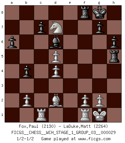 Last move : 1/2-1/2 2025 April 10 15:10:46 [Event "FICGS__CHESS__WCH_STAGE_1_GROUP_03__000029"] [Site "FICGS"] [Date "2025.02.02"] [Round "1"] [White "Fox,Paul"] [Black "LaDuke,Matt"] [Result "1/2-1/2"] [WhiteElo "2130"] [BlackElo "2264"] 1.e4 e5 2.Nf3 Nc6 3.Bb5 a6 4.Ba4 Nf6 5.O-O Be7 6.Re1 b5 7.Bb3 O-O 8.a4 b4 9.d3 d6 10.a5 Be6 11.Bxe6 fxe6 12.Nbd2 d5 13.h3 Qd6 14.Qe2 Nd7 15.Nb3 Rf7 16.d4 Raf8 17.c3 h6 18.Bd2 exd4 19.cxd4 e5 20.Rac1 Qg6 21.exd5 Nxa5 22.Nxa5 Rxf3 23.Rf1 Bd6 24.Nc4 Rxh3 25.Nxe5 Qh5 26.Qxh5 Rxh5 27.Nxd7 1/2-1/2 Follow this game move after move (download)Chess problems demand from the composer the same virtues that characterize all worthwhile art: originality, invention, conciseness, harmony, complexity, and splendid insincerity. (Vladimir Nabokov) Zu meiner Zeit war ein 20 jähriger ein junger Spieler, heute ist er ein Veteran. (Garry Kasparov) El Ajedrez, como cualquier otra actividad creativa, puede existir solo a través de méritos combinados de aquellos que tienen talento creativo y de aquellos que tienen la habilidad de organizar un trabajo creativo. (Mikhail Botvinnik) On peut tirer plus d'utilité d'une partie perdue que de 100 parties gagnées. (Capablanca) There is a computer disease that anybody who works with computers knows about. It's a very serious disease and it interferes completely with the work. The trouble with computers is that you 'play' with them ! (Richard P. Feynman)