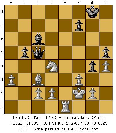 Last move : 0-1 2025 April 21 11:1:29 [Event "FICGS__CHESS__WCH_STAGE_1_GROUP_03__000029"] [Site "FICGS"] [Date "2025.02.02"] [Round "1"] [White "Haack,Stefan"] [Black "LaDuke,Matt"] [Result "0-1"] [WhiteElo "1720"] [BlackElo "2264"] 1.e4 e5 2.Nf3 Nc6 3.Bc4 Nf6 4.Ng5 d5 5.exd5 Na5 6.Bb5+ c6 7.dxc6 bxc6 8.Qf3 cxb5 9.Qxa8 Be7 10.b4 Nb7 11.Nc3 O-O 12.Qxa7 Nd5 13.Nxd5 Qxd5 14.Nf3 e4 15.Nd4 Bxb4 16.Nb3 e3 17.O-O e2 18.Re1 Nc5 19.Ba3 Bb7 20.f3 Ra8 21.Qxa8+ Bxa8 22.Bxb4 Ne6 23.Rxe2 Qc4 24.Rxe6 Qxe6 25.Bc3 g5 26.a3 h5 27.Kf2 Qb6+ 28.Nd4 Bc6 29.h4 g4 30.Re1 Qc5 0-1 Follow this game move after move (download)With or without the title, Bobby Fischer was unquestionably the greatest player of his time. (Burt Hochberg) Ich kenne Menschen, die allen Willen der Welt besitzen und doch nicht Schach spielen können. (Robert James Fischer) El Ajedrez lo es todo: arte, ciencia y deporte. (Anatoly Karpov) Karpov est une pièce de musée. (Garry Kasparov) If you are good, you will be assigned all the work. If you are really good, you will get out of it. (Dan Rotaru)
