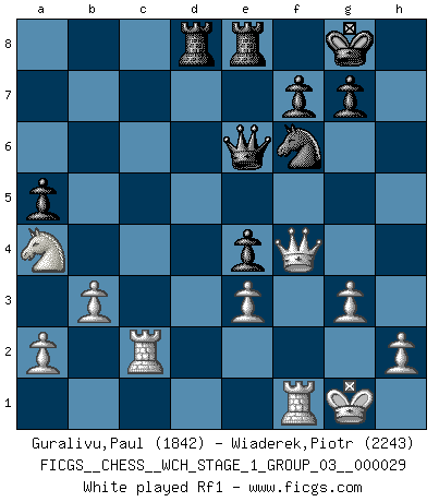 Last move : 0-1 2025 May 11 16:26:54 [Event "FICGS__CHESS__WCH_STAGE_1_GROUP_03__000029"] [Site "FICGS"] [Date "2025.02.02"] [Round "1"] [White "Guralivu,Paul"] [Black "Wiaderek,Piotr"] [Result "0-1"] [WhiteElo "1842"] [BlackElo "2243"] 1.d4 Nf6 2.c4 e6 3.Nc3 Bb4 4.Qc2 d5 5.e3 c5 6.Nf3 cxd4 7.Nxd4 Nc6 8.Nxc6 bxc6 9.Be2 O-O 10.O-O Bb7 11.b3 Qe7 12.Bb2 Rac8 13.Rfd1 Bd6 14.Rac1 Rfe8 15.g3 h5 16.Bf3 Rcd8 17.Bg2 Bb8 18.Rd2 h4 19.Qd1 a6 20.Na4 e5 21.Bc3 Bd6 22.Ba5 Rb8 23.Bb6 Bb4 24.Rdc2 Ba3 25.cxd5 cxd5 26.Bc5 Bxc5 27.Nxc5 Bc8 28.Bxd5 e4 29.Bc4 Bg4 30.Be2 Rbd8 31.Qf1 hxg3 32.fxg3 a5 33.Bxg4 Nxg4 34.Qf4 Nf6 35.Na4 Qe6 36.Rf1 Rd5 37.Nb2 Nh7 38.h4 Nf6 39.Rg2 Nh5 40.Qf2 f5 41.Qc2 Red8 42.Qc7 Kh7 43.Qc2 Nf6 0-1 Follow this game move after move (download)Chess is a more highly symbolic game, but the aggressions are therefore even more frankly represented in the play. It probably began as a war game; that is, the representation of a miniature battle between the forces of two kingdoms. (Karl Meninger) Bis zum Jahr 1971 verlief in meiner Schachkariere alles glatt. Dieses dramatische Match [Fischer-Taimanov 6:0] machte mein Leben zur Hölle. (Mark Taimanov) El ganar no lo es todo... pero el perder es nada. (Mednis) On croit qu'il y a plus de mauvais joueurs que de bons joueurs, c'est faux : Il y a autant de joueurs qui gagnent que de joueurs qui perdent. (Philippe Geluck) Now the reason the enlightened prince and the wise general conquer the enemy whenever they move and their achievements surpass those of ordinary men is foreknowledge. (Sun Tzu)