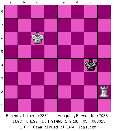 Last move : 1-0 2025 May 29 23:34:44 [Event "FICGS__CHESS__WCH_STAGE_1_GROUP_03__000029"] [Site "FICGS"] [Date "2025.02.02"] [Round "1"] [White "Pineda,Ulises"] [Black "Vasquez,Fernando"] [Result "1-0"] [WhiteElo "2231"] [BlackElo "2086"] 1.e4 e5 2.Nf3 Nf6 3.Nc3 Nc6 4.h3 Bb4 5.a3 Bxc3 6.dxc3 Nxe4 7.Nxe5 Nxe5 8.Qd5 d6 9.Qxe4 O-O 10.Be3 Re8 11.Qd4 Bf5 12.O-O-O Qd7 13.b3 a6 14.Be2 Qc6 15.f3 b5 16.Rhf1 Ng6 17.g4 Bd7 18.Rf2 Re7 19.f4 Nh4 20.Qd2 f5 21.Bd4 Rae8 22.Kb2 Qb7 23.c4 Bc6 24.cxb5 Bxb5 25.Bd3 fxg4 26.hxg4 Nf3 27.Qc3 Nxd4 28.Qxd4 Bxd3 29.Rxd3 Qe4 30.Qc3 h6 31.a4 Qe6 32.Ka2 Rf7 33.Qc6 R8e7 34.f5 Qe4 35.Qxa6 Qxg4 36.f6 Rxf6 37.Rxf6 gxf6 38.a5 Kf7 39.Qc6 Qd7 40.Qc4+ Qe6 41.Rd5 c5 42.a6 Kf8 43.Qd3 c4 44.bxc4 Ra7 45.Ra5 Ra8 46.Qd4 Kf7 47.Kb3 Rb8+ 48.Ka4 Rc8 49.Ka3 Rxc4 50.Qd3 Rc8 51.Rb5 f5 52.Rxf5+ Kg8 53.Qb3 d5 54.Qxd5 Qxd5 55.Rxd5 Ra8 56.Rd6 h5 57.Ka4 Kg7 58.Ka5 h4 59.Kb6 Rb8+ 60.Kc7 Rb2 61.a7 Rxc2+ 62.Kb7 Rb2+ 63.Rb6 Ra2 64.a8Q Rxa8 65.Kxa8 h3 66.Rb3 h2 67.Rh3 Kf6 68.Kb7 Kg5 69.Kc6 Kg4 70.Rxh2 1-0 Follow this game move after move (download)Chess is ruthless: you've got to be prepared to kill people. (Nigel Short) Es genügt nicht ein guter Spieler zu sein, man muß auch gut spielen. (Siegbert Tarrasch) Los Peones son nacidos libres, y aún así, se encuentran por doquier encadenados. (Rick Kennedy) Comme les marins qui ont mille raisons différentes d'aller en mer, les joueurs d'échecs en ont tout autant avant de s'installer devant une table et jouer... (Vincent Bertignac, philosophe) You think that education is too expensive ? Try ignorance. (Derek Bok)