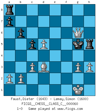 Last move : 1-0 2007 October 14 20:21:19 [Event "FICGS__CHESS__CLASS_C__000060"] [Site "FICGS"] [Date "2007.09.27"] [Round "1"] [White "Faust,Dieter"] [Black "Lemay,Simon"] [Result "1-0"] [WhiteElo "1643"] [BlackElo "1600"] 1.Nf3 g6 2.e4 Bg7 3.d4 Nf6 4.Bd3 d6 5.c3 O-O 6.O-O b6 7.Re1 Na6 8.Qe2 Nb8 9.Bf4 c5 10.Na3 Nc6 11.Nc2 Bg4 12.h3 Bxf3 13.Qxf3 e5 14.d5 Ne7 15.Bg5 h6 16.Bxf6 Qd7 17.Ne3 Nf5 18.Ng4 h5 19.Bxg7 hxg4 20.Qxg4 Kxg7 21.exf5 Qe8 22.f4 Rh8 23.Re2 Rh5 24.Rae1 Kf6 25.fxe5+ dxe5 26.Rxe5 Qxe5 27.Rxe5 Kxe5 28.fxg6 fxg6 29.Qe6+ Kf4 30.g3+ Kg5 31.Qxg6+ 1-0 Reti Opening Kingside Castling by player Black (move 5) Kingside Castling by player White (move 6) Player White won this chess game. Follow this game move after move (download)I still hope to kill Fischer. (Boris Spassky) Über die Verhaftung Bobby Fischers: Warum es die Bush-Administration für nötig befindet einen 61 Jahre alten Mann zu hetzten, der für niemanden ausser sich selbste eine Gefahr darstellt ist ein Rätsel. (Nigel Short) La esencia del Ajedrez es pensar acerca de lo que el Ajedrez es. (David Bronstein) Botvinnik disait en comparant les échecs à la musique: Il existe une science dont le but est l'étude de l'acoustique et des sons. Mais il y a aussi un art qui se sert de l'océan des sons : c'est la musique. De toute évidence, il en est de même pour la pensée. La logique est l'étude des lois de la réflexion et les échecs reflètent, en tant qu'art, le côté logique de la réflexion, sous la forme d'images artistiques... Extrait de Fischer - Spassky, Reykjavik 1972 par Alexander & F. Wyndham (Ed. Solar), p 37. A good aphorism is too hard for the tooth of time, and is not worn away with the centuries, although it serves as food for every speech. (Friedrich Nietzsche)