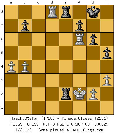 Last move : 1/2-1/2 2025 April 11 20:49:0 [Event "FICGS__CHESS__WCH_STAGE_1_GROUP_03__000029"] [Site "FICGS"] [Date "2025.02.02"] [Round "1"] [White "Haack,Stefan"] [Black "Pineda,Ulises"] [Result "1/2-1/2"] [WhiteElo "1720"] [BlackElo "2231"] 1.e4 c5 2.Nf3 h5 3.d4 cxd4 4.c3 dxc3 5.Nxc3 e6 6.Bc4 Nc6 7.O-O Be7 8.Bf4 d6 9.Qe2 e5 10.Be3 Be6 11.Rad1 Bxc4 12.Qxc4 Nf6 13.Nh4 g6 14.h3 Rc8 15.f4 Nd4 16.Qa4+ Qd7 17.Qxa7 Nb5 18.Nxb5 Qxb5 19.fxe5 dxe5 20.a4 Qb4 21.Nf3 O-O 22.Nxe5 Qxe4 23.Qd4 Qc2 24.Rd2 Qe4 25.Nd7 Rc4 26.Nxf6+ Bxf6 27.Qxe4 Rxe4 28.Rxf6 Rxe3 29.b4 Re1+ 30.Kf2 Rfe8 31.Rd8 R1e2+ 1/2-1/2 Follow this game move after move (download)If your opponent cannot do anything active, then don't rush the position; instead you should let him sit there, suffer, and beg you for a draw. (Jeremy Silman) Ich war zu klein für die Schach-Schülermannschaft! (Woody Allen) Todavía soy una víctima del Ajedrez. Tiene toda la belleza del arte y mucho mas. No puede ser comercializado. El Ajedrez es mas puro que el arte en su posición social. (Marcel Duchamp) Les échecs sont utiles à l'exercice de la faculté de penser et à celle de l'imagination. Car nous devons posséder une méthode élaborée pour atteindre des buts partout où nous devons conduire notre raison. (Leibnitz) Luck is the residue of design. (John Milton)