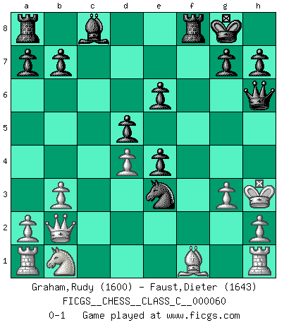 Last move : 0-1 2007 November 1 15:26:39 [Event "FICGS__CHESS__CLASS_C__000060"] [Site "FICGS"] [Date "2007.09.27"] [Round "1"] [White "Graham,Rudy"] [Black "Faust,Dieter"] [Result "0-1"] [WhiteElo "1600"] [BlackElo "1643"] 1.e4 e6 2.d4 d5 3.e5 c5 4.Be3 Qb6 5.b3 Nc6 6.dxc5 Bxc5 7.Bxc5 Qxc5 8.f4 f6 9.c3 Qe3+ 10.Qe2 Qc1+ 11.Kf2 Qxf4+ 12.Nf3 fxe5 13.g3 Qf6 14.Kg2 Nge7 15.Qb5 e4 16.Nd4 O-O 17.Qe2 Nxd4 18.cxd4 Nf5 19.Qb2 Ne3+ 20.Kh3 Qh6+ 0-1 French : Advance variation Kingside Castling by player Black (move 16) Player Black won this chess game. Follow this game move after move (download)Who is your opponent tonight, tonight I am playing against the Black pieces. (Akiba Rubinstein) Schach wird sich dank seiner hohen kulturellen Tradition immer durchsetzen. In näherer Zukunft womöglich sogar als Gegenreaktion auf die maßlose Reizüberflutung im Freizeit- und Spielbereich. (Garry Kasparov) El Ajedrez es tortura mental. (Garry Kasparov) La vérité est comme le meilleur coup aux échecs : elle existe, mais il faut la chercher. (Arturo Perez-Reverte) If you lose the game you should win the analysis! (Proverb)