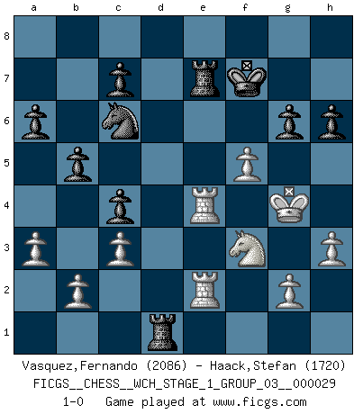 Last move : 1-0 2025 May 13 20:54:11 [Event "FICGS__CHESS__WCH_STAGE_1_GROUP_03__000029"] [Site "FICGS"] [Date "2025.02.02"] [Round "1"] [White "Vasquez,Fernando"] [Black "Haack,Stefan"] [Result "1-0"] [WhiteElo "2086"] [BlackElo "1720"] 1.e4 e5 2.Nf3 Nc6 3.d4 exd4 4.Nxd4 Bc5 5.Be3 Qf6 6.c3 Nge7 7.Bc4 O-O 8.O-O d6 9.Nxc6 Nxc6 10.Bxc5 dxc5 11.f4 Be6 12.Bb5 Rad8 13.Qe2 Bd7 14.Nd2 a6 15.Bd3 Bg4 16.Qxg4 Rxd3 17.Nf3 c4 18.Rae1 b5 19.e5 Qg6 20.Qh4 h6 21.h3 f6 22.Kh2 Qf5 23.exf6 Qxf6 24.Qxf6 Rxf6 25.Re4 Kf7 26.Rfe1 g6 27.R1e2 Rfd6 28.a3 Rd7 29.Kg3 Rd1 30.Kg4 Re7 31.f5 1-0 Follow this game move after move (download)Is Bobby Fischer quite sane ? (Salo Flohr) Es liegt in der Natur, vernüftig zu denken und unlogisch zu handeln. (Anatole France) En la vida, como en el Ajedrez, los Peones propios obstruyen nuestro camino. La gran fortuna de un hombre, su comodidad, placer, hijos, libros, que deberían ayudarle a ganar, con mucha frecuencia lo ponen en Jaque Mate. (Charles Buxton) Un millionnaire : 'Monsieur Steinitz ! Vous ne participez aux tournois que pour l'argent, alors que moi je n'y viens que pour l'honneur.' Steinitz : 'Chacun joue pour ce qu'il n'a pas'... There are two kinds of tragedy in this world, one is not getting what you want and the other is getting. (Lord of war)