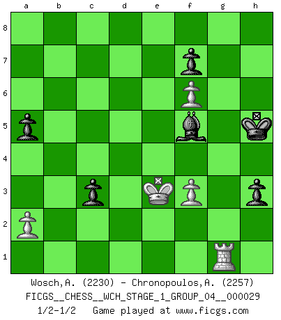 Last move : 1/2-1/2 2025 May 20 6:6:3 [Event "FICGS__CHESS__WCH_STAGE_1_GROUP_04__000029"] [Site "FICGS"] [Date "2025.02.02"] [Round "1"] [White "Wosch,Arkadiusz"] [Black "Chronopoulos,Antonis"] [Result "1/2-1/2"] [WhiteElo "2230"] [BlackElo "2257"] 1.e4 e5 2.Nf3 Nc6 3.Bc4 Bc5 4.c3 Nf6 5.d3 d6 6.O-O a5 7.h3 h6 8.Nbd2 Ba7 9.Re1 g5 10.Nf1 g4 11.hxg4 Nxg4 12.d4 Rg8 13.Be3 Qf6 14.Bb5 Nxe3 15.Nxe3 Kf8 16.Nd5 Qg7 17.g3 exd4 18.Kg2 Bg4 19.Bxc6 bxc6 20.Nf4 dxc3 21.bxc3 Qf6 22.Qd3 Re8 23.Re2 Re5 24.Rh1 Rc5 25.Rc2 Ke7 26.Nd4 Kd8 27.Kf1 Bb6 28.Nb3 Re5 29.Nd4 Rc5 30.Nb3 Rcg5 31.Nd4 Bd7 32.Rh4 Rg4 33.Rxg4 Rxg4 34.Qc4 Ke8 35.Nxc6 Rxf4 36.gxf4 Qh4 37.Nd4 Qh1+ 38.Ke2 Qxe4+ 39.Kd1 Bg4+ 40.Kc1 Kf8 41.Kb2 h5 42.Rd2 Bf5 43.Rd1 Bxd4 44.Qxd4 h4 45.f3 Qc2+ 46.Ka1 h3 47.c4 Be6 48.Re1 Qxc4 49.Qxc4 Bxc4 50.f5 Bd3 51.f6 c5 52.Rd1 Bg6 53.Rxd6 Kg8 54.Rd1 Kh7 55.Kb2 Kh6 56.Kc3 Kh5 57.Kd2 c4 58.Rg1 Bf5 59.Ke3 c3 1/2-1/2 Follow this game move after move (download)You can only get good at Chess if you love the game. (Bobby Fischer) Man braucht nicht immer den besten Zug zu spielen: Ein Zug muß aktiv, unternehmungslustig, korrekt und schön sein. (David Bronstein) El Ajedrez lo es todo: arte, ciencia y deporte. (Anatoly Karpov) Aux échecs, l'amour-propre est satisfait quand on remporte la victoire, mais il n'y a pas de honte à être battu. (Benjamin Franklin) Tree pose grows confidence. It roots me to this world. (Terri Guillemets)
