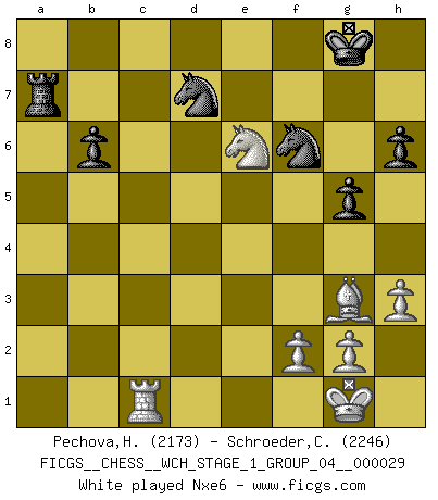 Last move : 0-1 2025 June 17 4:47:12 [Event "FICGS__CHESS__WCH_STAGE_1_GROUP_04__000029"] [Site "FICGS"] [Date "2025.02.02"] [Round "1"] [White "Pechova,Hana"] [Black "Schroeder,Christoph"] [Result "0-1"] [WhiteElo "2173"] [BlackElo "2246"] 1.d4 Nf6 2.c4 e6 3.Nc3 Bb4 4.e3 O-O 5.Bd3 d5 6.Nf3 c5 7.O-O dxc4 8.Bxc4 cxd4 9.exd4 b6 10.Bg5 Bb7 11.Qe2 Nbd7 12.Rac1 h6 13.Bh4 Rc8 14.Bd3 Be7 15.Ba6 Bxa6 16.Qxa6 Qc7 17.d5 Qc4 18.Qxc4 Rxc4 19.dxe6 fxe6 20.Rfd1 g5 21.Bg3 Rfc8 22.h3 Ba3 23.Rb1 Bxb2 24.Nb5 Rc1 25.Rbxc1 Bxc1 26.Nxa7 Rc2 27.Nd4 Rxa2 28.Rxc1 Rxa7 29.Nxe6 Ne4 0-1 This chess game has been lost on time (started : 2025.02.02 2:54:14) Follow this game move after move (download)Kasparov : J'adoube , Ivanchuk : S'il vous plaît ! (Garry Kasparov & Vassily Ivanchuk, Linares 1997) Ich würde die 30 stärksten Spieler der USA im Simultanspiel besiegen. (José Raúl Capablanca) Un mal plan es mejor que no tener ningún plan. (Frank Marshall) Ce qui est bien, c'est d'avoir tout un tas de pièces en prise : l'adversaire ne peut en prendre qu'une à la fois. Cité par Thierry Audin. Methinks King Thibault should dub Marius Zubac a knight of the square board... I mean table, henceforth addressing him as Sir Marius, and bestow on him a suitable land from the kingdom of FICGS & marry him off to a worthy, fair maiden, lest he slice our heads with his mighty sword in his wrath. (Dinesh De Silva)