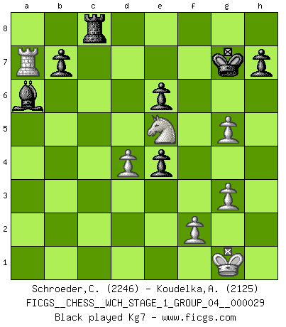 Last move : 1-0 2025 June 18 14:21:51 [Event "FICGS__CHESS__WCH_STAGE_1_GROUP_04__000029"] [Site "FICGS"] [Date "2025.02.02"] [Round "1"] [White "Schroeder,Christoph"] [Black "Koudelka,Artur"] [Result "1-0"] [WhiteElo "2246"] [BlackElo "2125"] 1.e4 e6 2.d4 d5 3.Nc3 Nf6 4.e5 Nfd7 5.Nce2 c5 6.c3 Nc6 7.a3 cxd4 8.cxd4 f6 9.exf6 Nxf6 10.Nf3 Bd6 11.g3 O-O 12.Bg2 Qa5+ 13.Bd2 Qb6 14.O-O Qxb2 15.Bf4 Bxf4 16.Nxf4 Ne4 17.a4 Rb8 18.Qd3 g5 19.Rab1 Qc3 20.Rfc1 Qxd3 21.Nxd3 Bd7 22.Nfe5 Nxe5 23.Nxe5 Bxa4 24.Ra1 Bb5 25.Bxe4 dxe4 26.Rxa7 Rfc8 27.Rxc8+ Rxc8 28.h4 Ba6 29.hxg5 Kg7 30.Nd7 Rc1+ 31.Kg2 1-0 This chess game has been lost on time (started : 2025.02.02 2:54:14) Follow this game move after move (download)Fischer is an American Chess tragedy on par with Morphy and Pillsbury. (Mig Greengard) Sie führen leise Selbstgespräche, schlürfen lautstark ihre Getränke, schmatzen hörbar beim Essen, blasen ihrem Gegenüber Rauch in die Augen, niesen ihm ins Gesicht, starren ihn unverwandt an, bis er sich unter ihren Blicken windet, rutschen ständig auf ihrem Stuhl hin und her, rülpsen und bohren in der Nase. (Anonymous) Es muy difícil jugar en contra de la teoría de Einstein. - en su primera derrota en contra de Fischer (Mikhail Tal) Les Echecs sont et restent toujours un combat, un combat intégral comme la boxe, la lutte ou un autre sport, et où il doit y avoir un vainqueur et un vaincu. (Joseph Emil Diemer) 98% of all statistics are made up. (Author unknown)