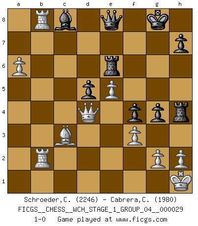 Last move : 1-0 2025 March 2 23:44:5 [Event "FICGS__CHESS__WCH_STAGE_1_GROUP_04__000029"] [Site "FICGS"] [Date "2025.02.02"] [Round "1"] [White "Schroeder,Christoph"] [Black "Cabrera,Claudio"] [Result "1-0"] [WhiteElo "2246"] [BlackElo "1980"] 1.e4 e5 2.Nf3 Nc6 3.Bb5 a6 4.Ba4 Nf6 5.O-O Nxe4 6.d4 b5 7.Bb3 d5 8.dxe5 Be6 9.c3 Bc5 10.Nbd2 O-O 11.Bc2 f5 12.Nb3 Ba7 13.Nbd4 Nxd4 14.Nxd4 Bxd4 15.Qxd4 c5 16.Qd1 f4 17.f3 Ng3 18.Re1 Qh4 19.a4 b4 20.cxb4 c4 21.Qd2 Nf5 22.Bxf5 Rxf5 23.Qf2 Qh6 24.Kh1 Rh5 25.Qg1 g5 26.Bd2 Rc8 27.b5 Rh4 28.bxa6 Ra8 29.Red1 Rxa6 30.Be1 Rh5 31.a5 Qg6 32.Rd4 Kh8 33.Ra3 Qc2 34.Bc3 Rh4 35.Rd2 Qg6 36.b4 cxb3 37.Rxb3 g4 38.Qc5 Qe8 39.Rdb2 Rc6 40.Qa7 Kg8 41.Rb8 Bc8 42.Qd4 Re6 43.a6 1-0 Follow this game move after move (download)I feel as if I were a piece in a game of Chess, when my opponent says of it: That piece cannot be moved. (Soren Kierkegaard) Viele Opfer benötigen überhaupt keine konkrete Berechnung. Es genügt sich die entstehende Position kurz vorzustellen, um uns davon zu überzeugen, dass das Opfer korrekt ist. (Mikhail Nekhemyevich Tal) El Ajedrez es un juego de pelea el cual es puramente intelectual e incluye la suerte. (Richard Reti) À la honte des hommes, on sait que les lois du jeu sont les seules qui soient partout justes, claires, inviolables et exécutées. Pourquoi l'Indien qui a donné les règles du jeu d'échecs est-il obéi de bon gré dans toute la terre, et que les décrétales des papes, par exemple, sont aujourd'hui un objet d'horreur et de mépris ? C'est que l'inventeur des échecs combina tout avec justesse pour la satisfaction des joueurs, et que les papes, dans leurs décrétales, n'eurent en vue que leur seul avantage. L'Indien voulut exercer également l'esprit des hommes et leur donner du plaisir; les papes ont voulu abrutir l'esprit des hommes. Voltaire (Dictionnaire philosophique / Garnier 1967) The problem with manipulation is that people can turn on you. (Horatio Caine, C.S.I. Miami)