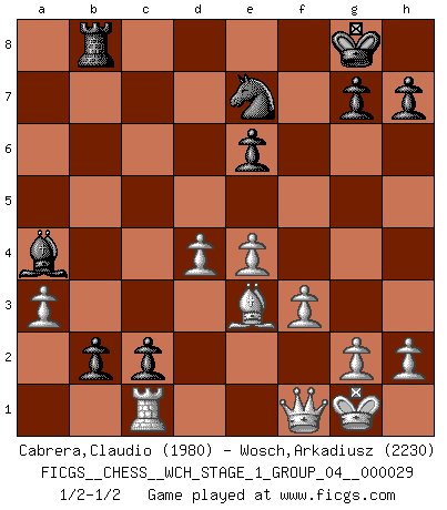 Last move : 1/2-1/2 2025 April 3 0:37:5 [Event "FICGS__CHESS__WCH_STAGE_1_GROUP_04__000029"] [Site "FICGS"] [Date "2025.02.02"] [Round "1"] [White "Cabrera,Claudio"] [Black "Wosch,Arkadiusz"] [Result "1/2-1/2"] [WhiteElo "1980"] [BlackElo "2230"] 1.d4 Nf6 2.c4 e6 3.Nc3 Bb4 4.f3 d5 5.a3 Bxc3+ 6.bxc3 c6 7.e3 O-O 8.Bd3 dxc4 9.Bxc4 Qc7 10.Ne2 c5 11.Qc2 Bd7 12.Qa2 Nc6 13.O-O Na5 14.Bd3 Ba4 15.e4 a6 16.Bf4 Qd7 17.Rab1 b5 18.Qd2 Kh8 19.Rfe1 Rac8 20.Be3 Ng8 21.Nf4 Ne7 22.Bf1 Rfd8 23.Qf2 cxd4 24.cxd4 Nc4 25.Bxc4 bxc4 26.Rec1 c3 27.Nd3 c2 28.Rb4 a5 29.Ne5 axb4 30.Nxd7 b3 31.Ne5 b2 32.Nxf7+ Kg8 33.Nxd8 Rxd8 34.Qf1 Rb8 1/2-1/2 Follow this game move after move (download)After black's reply to 1.e4 with 1..e5, leaves him always trying to get into the game. (Howard Staunton) Gott hat gewollt, dass ich Champion werde. (Surab Azmajparaschvili) Nunca nadie ha ganado una partida de Ajedrez rindiendose. (Unknown) J'ai vu le vaincu d'Echecs jouer des années durant dans l'espoir de la fête de la victoire. Car tu es plus riche de ce qu'elle existe si même elle n'est point pour toi. Ainsi de la perle du fond des mers. (Antoine de Saint-Exupéry) The mind is like a parachute, it only functions when its open. (Unknown)