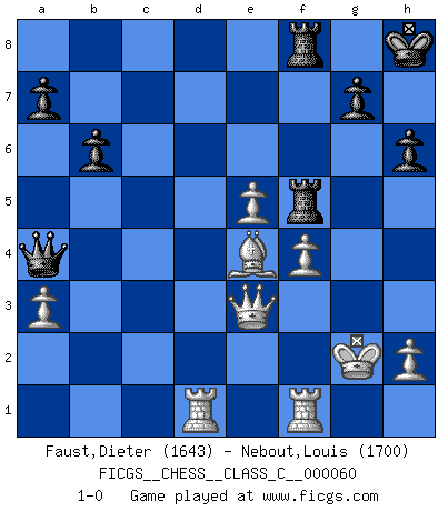 Last move : 1-0 2007 November 2 12:5:42 [Event "FICGS__CHESS__CLASS_C__000060"] [Site "FICGS"] [Date "2007.09.27"] [Round "1"] [White "Faust,Dieter"] [Black "Nebout,Louis"] [Result "1-0"] [WhiteElo "1643"] [BlackElo "1700"] 1.Nf3 d5 2.d4 Nf6 3.c4 dxc4 4.Qa4+ Nc6 5.Nc3 e6 6.Qxc4 Be7 7.Bg5 O-O 8.e3 Na5 9.Qa4 b6 10.Qc2 Bb7 11.Bd3 h6 12.Bxf6 Bxf6 13.Rd1 Qe7 14.Ne4 Rac8 15.Nxf6+ Qxf6 16.b4 Bxf3 17.gxf3 Qxf3 18.Be4 Qg4 19.bxa5 f5 20.Bb7 Rce8 21.Qxc7 f4 22.Qe5 fxe3 23.Qxe3 e5 24.dxe5 Qb4+ 25.Kf1 Qxa5 26.Bd5+ Kh8 27.Kg2 Rf5 28.f4 Qb4 29.Rhf1 Ref8 30.a3 Qa4 31.Be4 1-0 Reti Opening Kingside Castling by player Black (move 7) Player White won this chess game. Follow this game move after move (download)We must make sure that Chess will not be like a dead language, very interesting, but for a very small group. (Sytze Faber) Frage: Wie viele Autos haben Sie schon zerstört? - Antwort: Nur zwei. (Loek van Wely) De todos mis libros Rusos, la defensa contiene y difunde el 'calor' mas grande que pudiese verse extraño al observar lo supremamente abstracto que el Ajedrez supuestamente es. (Vladimir Nabokov) Je ne suis pas le dernier à jouer lâchement des coups douteux pendant le zeïtnot de l'adversaire pour l'achever: en effet les coups qui font le plus peur sont ceux que l'on ne comprend pas. Je me fais souvent peur quand je joue. (Un professeur anonyme) Life is like a game of cards: the hand you are dealt represents determinism; the way you play it is free will. (Jawaharlal Nehru)