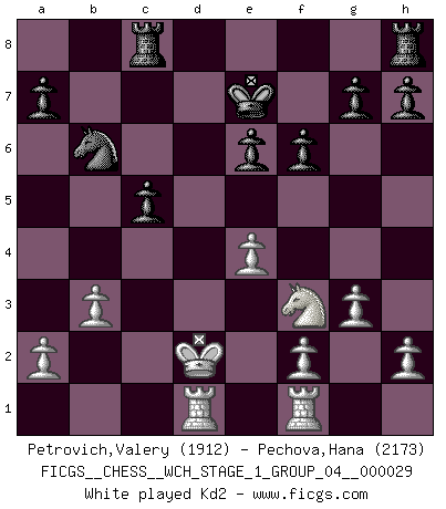 Last move : 1-0 2025 June 10 23:17:35 [Event "FICGS__CHESS__WCH_STAGE_1_GROUP_04__000029"] [Site "FICGS"] [Date "2025.02.02"] [Round "1"] [White "Petrovich,Valery"] [Black "Pechova,Hana"] [Result "1-0"] [WhiteElo "1912"] [BlackElo "2173"] 1.Nf3 Nf6 2.c4 c5 3.Nc3 Nc6 4.g3 d5 5.d4 cxd4 6.Nxd4 dxc4 7.Nxc6 Qxd1+ 8.Nxd1 bxc6 9.Bg2 Nd5 10.Ne3 e6 11.Nxc4 Ba6 12.b3 Bb4+ 13.Bd2 Ke7 14.Ne5 Rac8 15.Bxb4+ Nxb4 16.O-O-O Nd5 17.e4 Nb6 18.Bf1 Bxf1 19.Rhxf1 f6 20.Nf3 c5 21.Kd2 a5 22.Rc1 Rhd8+ 23.Ke2 c4 24.Nd2 cxb3 25.axb3 a4 26.Rxc8 Rxc8 27.bxa4 Nxa4 28.Ra1 Ra8 29.Ke3 e5 30.f4 Nb6 31.Rxa8 Nxa8 32.Kf3 Nb6 33.Ke3 Kd6 34.h3 Nd7 35.Nc4+ 1-0 Follow this game move after move (download)Fischer Chess play was always razor-sharp, rational and brilliant. One of the best ever. (Dave Regis) Verschiedene, sehr schätzbare und im Laufe des Lebens nützliche Eigenschaften des Geistes können durch das Schachspiel erworben und gekräftigt werden, so dass sie zu Gewohnheiten werden, die uns nie im Stich lassen. (Benjamin Franklin) Un mal plan es mejor que no tener ningún plan. (Frank Marshall) L'attaque fait le spectacle, la défense gagne les matchs. (Dicton footballistique) There is a very easy way to return from a casino with a small fortune : go there with a large one. (Jack Yelton)