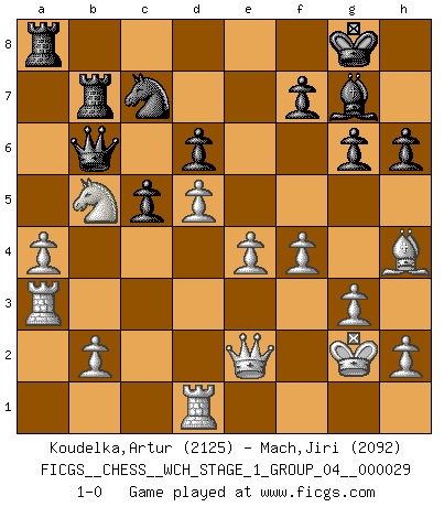 Last move : 1-0 2025 June 4 1:11:35 [Event "FICGS__CHESS__WCH_STAGE_1_GROUP_04__000029"] [Site "FICGS"] [Date "2025.02.02"] [Round "1"] [White "Koudelka,Artur"] [Black "Mach,Jiri"] [Result "1-0"] [WhiteElo "2125"] [BlackElo "2092"] 1.d4 Nf6 2.c4 c5 3.d5 b5 4.cxb5 a6 5.bxa6 Bxa6 6.Nc3 g6 7.e4 Bxf1 8.Kxf1 d6 9.Nf3 Bg7 10.g3 O-O 11.Kg2 Nbd7 12.a4 Qb6 13.Qe2 Rfb8 14.Nb5 Ne8 15.Bg5 h6 16.Bxe7 Rb7 17.Ra3 Ne5 18.Nxe5 Bxe5 19.f4 Bg7 20.Bh4 Nc7 21.Rd1 1-0 Follow this game move after move (download)I don't believe in psychology. I believe in good moves. (Bobby Fischer) Im Spitzenschach von heute geht es nur um Vorbereitung, um tiefgründige, sorgfältige Eröffnungsvorbereitung. (Nigel Short) El Ajedrez es parte de una cultura y si una cultura esta en decadencia, entonces también el Ajedrez declinará. (Mikhail Botvinnik) Dieu déplace le joueur, et celui-ci la pièce. Quel Dieu derrière Dieu commence donc la trame ? Arturo Perez-Reverte (prix de littérature policière 1993). Players are not good because they find tactics, it is about the way to find the positions in which those tactics are hidden. (Luc-Olivier Leclerc)