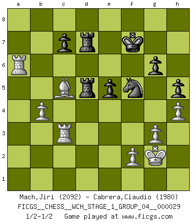 Last move : 1/2-1/2 2025 April 27 3:29:44 [Event "FICGS__CHESS__WCH_STAGE_1_GROUP_04__000029"] [Site "FICGS"] [Date "2025.02.02"] [Round "1"] [White "Mach,Jiri"] [Black "Cabrera,Claudio"] [Result "1/2-1/2"] [WhiteElo "2092"] [BlackElo "1980"] 1.e4 e5 2.Nf3 Nc6 3.Bb5 a6 4.Ba4 Nf6 5.O-O Nxe4 6.d4 b5 7.Bb3 d5 8.dxe5 Be6 9.Nbd2 Nc5 10.c3 d4 11.Bxe6 Nxe6 12.cxd4 Ncxd4 13.a4 Bc5 14.Ne4 Be7 15.Nxd4 Qxd4 16.Qxd4 Nxd4 17.axb5 Nxb5 18.Be3 O-O 19.Ra4 Rfd8 20.Rfa1 a5 21.Kf1 Bb4 22.Nc5 h6 23.g3 Bxc5 24.Bxc5 Rd5 25.b4 Rb8 26.e6 fxe6 27.Rxa5 e5 28.Kg2 Nd4 29.Rd1 Rbd8 30.Rd3 Kf7 31.Ra6 R8d7 32.Rc3 h5 33.h3 g6 34.Ba7 Ke7 35.Bc5+ Kf7 36.h4 Nf5 1/2-1/2 Follow this game move after move (download)If one piece is badly posted, the whole game is bad. (Tarrasch) Früher wurde jeder komplizierte Zug, jedes interessante Opfer mit großem Beifall und Enthusiasmus aufgenommen. Heute schaltet man einfach seinen Fritz an, und man kann sehen, was los ist, ob der Zug geht oder nicht. (Vladimir Kramnik) Las leyes del Ajedrez no permiten una libre elección: tienes que mover quieras o no. (Emanuel Lasker) C'est la seule position que je connaisse où les deux camps sont mals. Propos prêtés à V. Anand. Children in the dark cause accidents, accidents in the dark cause children. (Unknown)