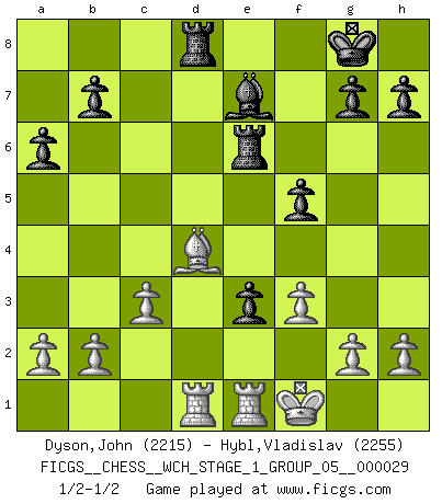 Last move : 1/2-1/2 2025 June 2 1:2:35 [Event "FICGS__CHESS__WCH_STAGE_1_GROUP_05__000029"] [Site "FICGS"] [Date "2025.02.02"] [Round "1"] [White "Dyson,John"] [Black "Hybl,Vladislav"] [Result "1/2-1/2"] [WhiteElo "2215"] [BlackElo "2255"] 1.e4 c5 2.Nf3 d6 3.d4 cxd4 4.Nxd4 Nf6 5.Nc3 a6 6.Be3 e5 7.Nf3 Be7 8.Bc4 O-O 9.O-O Nc6 10.Re1 Be6 11.Bf1 d5 12.exd5 Nxd5 13.Nxd5 Bxd5 14.c3 Rc8 15.Qd2 Be6 16.Qxd8 Rfxd8 17.Bb6 Rd5 18.Bc4 Rd6 19.Bxe6 Rxe6 20.Rad1 e4 21.Nd4 Nxd4 22.Bxd4 Rd8 23.Kf1 f5 24.f3 e3 1/2-1/2 Follow this game move after move (download)I'd rather have a Pawn than a finger. (Reuben Fine) Das Schach ist nichts für kleine Geister, es beansprucht einen vollen Mann, der sich nicht sklavisch an das Überlieferte hält, sondern selbständig die Tiefen des Spiels zu ergründen sucht. (Wilhelm Steinitz) Evita las multitudes. Haz independientemente tu propio razonamiento. Trata de ser el jugador de Ajedrez, no la pieza de Ajedrez. (Ralph Charell) Je menace de comprendre la position. (Anonyme) Faith : not wanting to know what is true. (Friedrich Nietzsche)