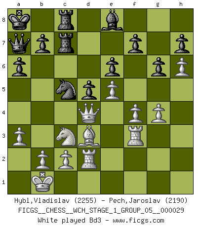 Last move : 1-0 2025 June 18 18:7:17 [Event "FICGS__CHESS__WCH_STAGE_1_GROUP_05__000029"] [Site "FICGS"] [Date "2025.02.02"] [Round "1"] [White "Hybl,Vladislav"] [Black "Pech,Jaroslav"] [Result "1-0"] [WhiteElo "2255"] [BlackElo "2190"] 1.e4 e6 2.d4 d5 3.Nc3 Nf6 4.e5 Nfd7 5.f4 c5 6.Nf3 Nc6 7.Be3 cxd4 8.Nxd4 Bc5 9.Qd2 a6 10.O-O-O Nxd4 11.Bxd4 Bxd4 12.Qxd4 Qb6 13.Qd2 Nc5 14.h4 Bd7 15.Qd4 O-O-O 16.h5 Kb8 17.g4 Rc8 18.h6 g6 19.Rh3 Rc7 20.a3 Rhc8 21.Kb1 Qa7 22.Rf3 Be8 23.Rd2 Ka8 24.Bd3 Bc6 25.Rg3 Be8 26.Bf1 Kb8 27.f5 1-0 This chess game has been lost on time (started : 2025.02.02 2:54:16) Follow this game move after move (download)Chess is the art which expresses the science of logic. (Mikhail Botvinnik) Alles was ich jemals tun will ist Schach spielen. (Robert James Fischer) No existe un remordimiento como el remordimiento del Ajedrez. (H. G. Wells) La menace est plus forte que l'exécution. (Aaron Nimzovitch) Mac users swear by their computers. PC users swear at their computers. (Author unknown)