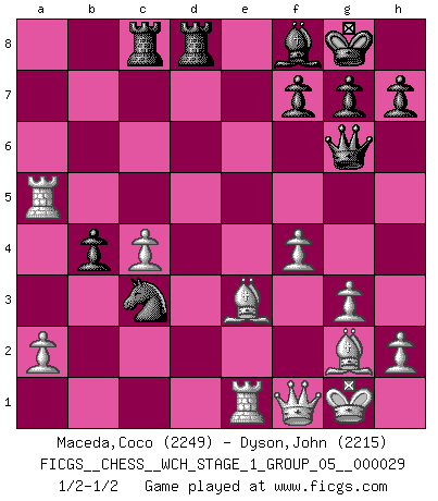 Last move : 1/2-1/2 2025 June 7 12:10:35 [Event "FICGS__CHESS__WCH_STAGE_1_GROUP_05__000029"] [Site "FICGS"] [Date "2025.02.02"] [Round "1"] [White "Maceda,Coco"] [Black "Dyson,John"] [Result "1/2-1/2"] [WhiteElo "2249"] [BlackElo "2215"] 1.d4 d5 2.c4 e6 3.Nf3 Nf6 4.g3 dxc4 5.Bg2 c5 6.O-O Nc6 7.Qa4 Bd7 8.Qxc4 b5 9.Qd3 c4 10.Qc2 Be7 11.Nc3 b4 12.Ne4 Rc8 13.Nxf6+ Bxf6 14.Rd1 O-O 15.e4 e5 16.dxe5 Nxe5 17.Bf4 Nd3 18.e5 Be7 19.Be3 Be6 20.Qe2 Qc7 21.Nd4 Qxe5 22.b3 a5 23.f4 Qd6 24.Nxe6 Qxe6 25.bxc4 Nc5 26.Rd5 Na4 27.Re5 Qd6 28.Rxa5 Nc3 29.Qd2 Qg6 30.Re1 Rfd8 31.Qf2 Bf8 32.Qf1 Qc2 33.Qf2 Qg6 34.Qf1 1/2-1/2 Follow this game move after move (download)If your opponent cannot do anything active, then don't rush the position; instead you should let him sit there, suffer, and beg you for a draw. (Jeremy Silman) Ich habe die besten Aussichten, den ersten Preis zu gewinnen - denn jeder muss gegen Steinitz spielen, nur ich nicht! (Wilhelm Steinitz) No soy una persona materialista y por eso, no resiento la falta o pérdida del dinero. La ausencia de cosas mundanas carece de importancia. Ya que el Ajedrez es una forma en la que puedo ser tan materialista como yo desee sin tener la necesidad de vender mi alma. (Jamie Walter Adams) Pour se monter efficace, un Cavalier a besoin d'avant-postes ! Les Cavaliers font les meilleurs bloqueurs de pions passés. Industry executives and analysts often mistakenly talk about strategy as if it were some kind of chess match. But in chess, you have just two opponents, each with identical resources, and with luck playing a minimal role. The real world is much more like a poker game, with multiple players trying to make the best of whatever hand fortune has dealt them. In our industry, Bill Gates owns the table until someone proves otherwise. (David Moschella, 'Computerworld')