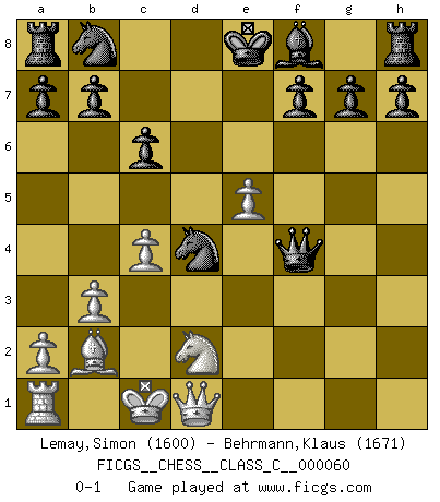Last move : 0-1 2007 October 19 14:43:16 [Event "FICGS__CHESS__CLASS_C__000060"] [Site "FICGS"] [Date "2007.09.27"] [Round "1"] [White "Lemay,Simon"] [Black "Behrmann,Klaus"] [Result "0-1"] [WhiteElo "1600"] [BlackElo "1671"] 1.e4 c6 2.f4 d5 3.e5 Bf5 4.b3 e6 5.Bb2 Ne7 6.d4 Ng6 7.g4 Qh4+ 8.Kd2 Be4 9.f5 Qg5+ 10.Ke1 exf5 11.Nh3 Qh4+ 12.Kd2 Bxh1 13.gxf5 Ne7 14.Kc1 Nxf5 15.Bd3 Be4 16.c4 Qxh3 17.Bxe4 dxe4 18.Nd2 Qxh2 19.Nxe4 Qf4+ 20.Nd2 Nxd4 0-1 Caro-Kann defense Player Black won this chess game. Follow this game move after move (download)Fischer is under obligation to nobody. (Joseph Platz) Ein Kibitz ist einer, der deinem Gegner gute Ratschläge gibt. (Andrew Soltis) Alekhine es un poeta que crea un trabajo de arte de algo que raramente inspiraría a otra persona a mandar una tarjeta postal. (Max Euwe) Si je n'étais pas joueur d'échecs, je serais le meilleur dans quelque chose d'autre. (Anatoli Karpov) May the force be with you. (Han Solo in Star Wars ep.4)