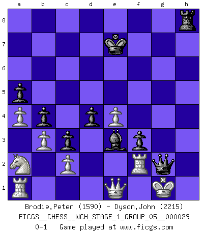 Last move : 0-1 2025 April 25 5:54:25 [Event "FICGS__CHESS__WCH_STAGE_1_GROUP_05__000029"] [Site "FICGS"] [Date "2025.02.02"] [Round "1"] [White "Brodie,Peter"] [Black "Dyson,John"] [Result "0-1"] [WhiteElo "1590"] [BlackElo "2215"] 1.Nf3 d5 2.d4 Nf6 3.Bf4 e6 4.Nc3 c5 5.e3 a6 6.Be2 b5 7.a3 Nbd7 8.O-O Bb7 9.a4 b4 10.Na2 c4 11.b3 c3 12.Ne1 Ne5 13.Bxe5 Ne4 14.f3 Nd2 15.Rf2 f6 16.Bf4 g5 17.Bg3 h5 18.h3 e5 19.dxe5 Bc5 20.exf6 Bxe3 21.Nd3 a5 22.Be5 d4 23.f7+ Kxf7 24.Bxh8 Qxh8 25.Qe1 Qb8 26.Nc5 Qg3 27.Nxb7 Ke7 28.Nc5 g4 29.hxg4 hxg4 30.Ne4 Nxe4 31.fxe4 Rf8 32.Bf3 gxf3 33.Qf1 Rh8 34.Qe1 Qxg2+ 0-1 Follow this game move after move (download)Is Bobby Fischer quite sane ? (Salo Flohr) Ich suche im Schach immer etwas Eigenes. Riskantes Spiel im Stile schachlicher Musketiere ist nicht meine Sache, auch wenn es vielen Freunden scharfer Wendungen gefällt. (Anatoly Karpov) Una mala movida nulifica cuarenta buenas. (Horowitz) Karpov est une pièce de musée. (Garry Kasparov) Luck never made a man wise. (Seneca, Letters to Lucilius)