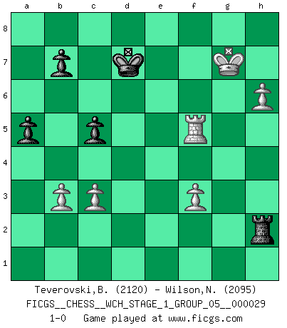 Last move : 1-0 2025 March 11 8:32:51 [Event "FICGS__CHESS__WCH_STAGE_1_GROUP_05__000029"] [Site "FICGS"] [Date "2025.02.02"] [Round "1"] [White "Teverovski,Bogoljub"] [Black "Wilson,Norman"] [Result "1-0"] [WhiteElo "2120"] [BlackElo "2095"] 1.e4 e5 2.Nf3 Nc6 3.Bb5 a6 4.Ba4 d6 5.c3 Bd7 6.d4 Nf6 7.O-O Nxe4 8.Re1 Nf6 9.Bxc6 Bxc6 10.dxe5 dxe5 11.Qxd8+ Kxd8 12.Nxe5 Bd5 13.Bg5 Be6 14.Nd2 Bd6 15.Nd3 h6 16.Bxf6+ gxf6 17.Ne4 Ke7 18.Nxd6 Kxd6 19.Nf4 Rae8 20.f3 Kd7 21.b3 Rhg8 22.Rad1+ Kc8 23.Nh5 Rg6 24.Kf2 f5 25.Nf4 R6g8 26.Rd2 Bd7 27.Rxe8+ Rxe8 28.Kg3 Rg8+ 29.Kh4 Bc6 30.Kh5 Rh8 31.Nd5 Re8 32.Kxh6 Bxd5 33.Rxd5 Rh8+ 34.Kg5 Rg8+ 35.Kxf5 Rxg2 36.h4 Rxa2 37.Kf6 Rf2 38.Rf5 Kd7 39.Kxf7 c5 40.h5 a5 41.h6 Rh2 42.Kg7 1-0 Follow this game move after move (download)I'm not a materialistic person, in that, I don't suffer the lack or loss of money. The absence of worldly goods I don't look back on. For Chess is a way I can be as materialistic as I want without having to sell my soul. (Jamie Walter Adams) Kein Großmeister ist normal. Sie unterscheiden sich nur im Ausmaß Ihrer Verrücktheit. (Viktor Kortschnoi) Un sacrificio se refuta mucho mejor al aceptarlo. (Wilhelm Steinitz) Demandez au pauvre Cg1 ce qu'il en pense. Eduard Gufeld à propos de la variante Saemisch de l'Est-Indienne. Life is verb, not a noun. (Charlotte Perkins Gilman)