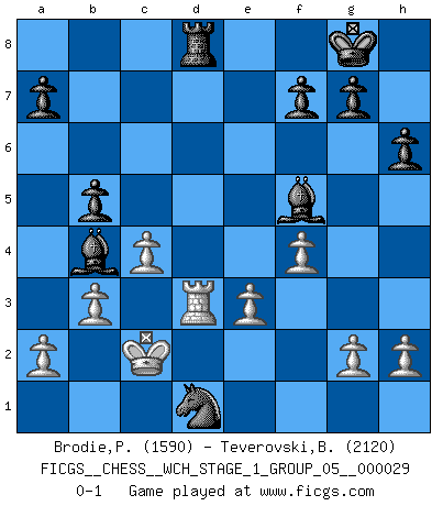 Last move : 0-1 2025 April 3 23:11:34 [Event "FICGS__CHESS__WCH_STAGE_1_GROUP_05__000029"] [Site "FICGS"] [Date "2025.02.02"] [Round "1"] [White "Brodie,Peter"] [Black "Teverovski,Bogoljub"] [Result "0-1"] [WhiteElo "1590"] [BlackElo "2120"] 1.d4 Nf6 2.Bf4 c5 3.dxc5 Nc6 4.Nc3 e5 5.Be3 h6 6.Nf3 d5 7.Nb5 Qa5+ 8.Nc3 d4 9.Nxd4 exd4 10.Bxd4 Nxd4 11.Qxd4 Bxc5 12.Qa4+ Qxa4 13.Nxa4 Bb4+ 14.c3 Be7 15.e3 O-O 16.Be2 Bd7 17.b3 b5 18.Nb2 Rac8 19.Rc1 Nd5 20.c4 Bb4+ 21.Kd1 Nc3+ 22.Kc2 Nxe2 23.Rcd1 Bf5+ 24.Nd3 Rfd8 25.f4 Nc3 26.Rd2 Rxd3 27.Rxd3 Rd8 28.Rhd1 Nxd1 0-1 Follow this game move after move (download)Nothing excites jaded Grandmasters more than a theoretical novelty. (Dominic Lawson) Später, ... hatte ich zunehmend Erfolg in entscheidenden Partien. Vielleicht weil ich eine einfache Wahrheit erkannte: nicht nur ich hatte Angst, auch mein Gegner. (Mikhail Nekhemyevich Tal) Sin errores no puede haber brillantez. (Emanuel Lasker) Les réformistes prétendent que les progrès de la théorie conduiront à la disparition des échecs, et qu'il faut, pour leur rendre vie, en remanier les règles. En réalité, qu'exprime cette affirmation? Le mépris de l'intuition, de l'imagination et de tous les autres éléments qui font des échecs un art. (Alexander Alekhine) In my experience, there's no such thing as luck. (Obi-Wan Kenobi in Star Wars ep.4)