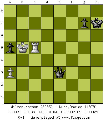 Last move : 0-1 2025 March 11 8:29:16 [Event "FICGS__CHESS__WCH_STAGE_1_GROUP_05__000029"] [Site "FICGS"] [Date "2025.02.02"] [Round "1"] [White "Wilson,Norman"] [Black "Nudo,Davide"] [Result "0-1"] [WhiteElo "2095"] [BlackElo "1979"] 1.e4 c6 2.d4 d5 3.e5 c5 4.dxc5 e6 5.a3 Bxc5 6.Nf3 f6 7.b4 Be7 8.Bb2 a5 9.b5 Nd7 10.c4 Nxe5 11.Nxe5 fxe5 12.Bxe5 Nf6 13.Be2 O-O 14.O-O Nd7 15.Bg3 Nc5 16.Nd2 b6 17.Qc2 Bb7 18.Rad1 d4 19.Bd3 h5 20.Rfe1 Nxd3 21.Qxd3 h4 22.Be5 Qe8 23.Bxd4 Rd8 24.Rxe6 Rxf2 25.Nf3 Rxf3 26.gxf3 Qf7 27.Rxb6 Bc5 28.Bxc5 Rxd3 29.Rxd3 Bxf3 30.Rd8+ Kh7 31.Rd4 Qh5 32.Bd6 Qg6+ 33.Kf2 Qg2+ 34.Ke3 Qe2+ 35.Kf4 Bg2 36.Bc5 Qh5 37.Rd5 Bxd5 38.cxd5 Qxd5 39.Rc6 Qc4+ 40.Ke5 Qxb5 41.Rc7 Qe2+ 42.Kd5 Qxh2 43.Bd6 Qd2+ 44.Ke6 h3 45.Rc5 Qh6+ 46.Kd5 h2 47.Bxh2 Qxh2 48.Kc6 Qh6+ 49.Kb5 Qe3 0-1 Follow this game move after move (download)A thorough understanding of the typical mating continuations makes the most complicated sacrificial combinations leading up to them not only not difficult, but almost a matter of course. (Siegbert Tarrasch) Der zweitbeste Zug ist oft der einzig richtige. (Savielly Grigorievitsch Tartakower) La estratégia requiere pensar, la táctica requiere observación. (Max Euwe) Le profane ne songe pas à la somme de jouissance dont il se prive, qui méconnaît ce jeu aux ressources aussi variées que passionnantes. (Jean-Marie Jeanton-Lamarche) Two beer, or not two beer. (Unknown)