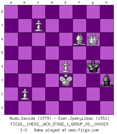 Last move : 1-0 2025 April 3 14:21:10 [Event "FICGS__CHESS__WCH_STAGE_1_GROUP_05__000029"] [Site "FICGS"] [Date "2025.02.02"] [Round "1"] [White "Nudo,Davide"] [Black "Eser,Ipekyilmaz"] [Result "1-0"] [WhiteElo "1979"] [BlackElo "1951"] 1.e4 b6 2.d4 Bb7 3.Bd3 a6 4.Qe2 b5 5.Nd2 e6 6.Nb3 f6 7.Nh3 Nc6 8.c3 Qc8 9.O-O Nd8 10.a4 c6 11.Be3 Be7 12.Nf4 Nf7 13.Nc5 Bxc5 14.dxc5 Qd8 15.Rfd1 Qe7 16.h3 Kf8 17.axb5 axb5 18.Rxa8+ Bxa8 19.c4 bxc4 20.Bxc4 Bb7 21.Qd2 Bc8 22.Ra1 Qe8 23.Ra8 g6 24.Nd3 Kg7 25.f4 Ngh6 26.g4 Rf8 27.Ba6 Bxa6 28.Rxe8 Rxe8 29.g5 Ng8 30.Nf2 Kf8 31.Qxd7 Bb5 32.Ng4 fxg5 33.Ne5 Nxe5 34.Qd6+ Kf7 35.Qxe5 Nf6 36.Bd4 Nh5 37.fxg5 Ba4 38.Kf2 Rf8 39.Ke3 Bb5 40.Qc7+ Kg8 41.Be5 Bf1 42.Qxc6 Ng7 43.Qd7 Rf7 44.Qc8+ Rf8 45.Qb7 Rf7 46.Qc8+ Rf8 47.Qd7 Rf7 48.c6 Ba6 49.Qd8+ Rf8 50.Qc7 Nh5 51.Qe7 Rf7 52.Qe8+ Rf8 53.Qxe6+ Rf7 54.c7 Bb7 55.Bd6 Kg7 56.Qe8 Nf6 57.gxf6+ Rxf6 58.Be5 Bc8 59.Qe7+ Kh6 60.Bxf6 Bxh3 61.Qg7+ Kh5 62.Qxh7+ Kg4 63.Qxg6+ 1-0 Follow this game move after move (download)We don't really know how the game was invented, though there are suspicions. As soon as we discover the culprits, we'll let you know. (Bruce Pandolfini) Es hat in meinem Leben Zeiten gegeben, da ich sehr nahe daran war zu glauben, daß ich auch nicht eine einzige Schachpartie verlieren könnte. (José Raúl Capablanca) Existen dos clases de sacrificios: los correctos y los míos. (Mikhail Tal) Il vaut toujours mieux jouer un plan faux de façon logique que de n'avoir pas de plan du tout. (Victor Kortchnoï) Creativity is inventing, experimenting, growing, taking risks, breaking rules, making mistakes, and having fun. (Mary Lou Cook)