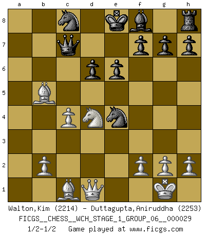 Last move : 1/2-1/2 2025 February 24 5:49:11 [Event "FICGS__CHESS__WCH_STAGE_1_GROUP_06__000029"] [Site "FICGS"] [Date "2025.02.02"] [Round "1"] [White "Walton,Kim"] [Black "Duttagupta,Aniruddha"] [Result "1/2-1/2"] [WhiteElo "2214"] [BlackElo "2253"] 1.e4 c5 2.Nf3 d6 3.Bb5+ Nd7 4.O-O a6 5.Bd3 Ngf6 6.c3 b5 7.a4 Bb7 8.axb5 axb5 9.Rxa8 Qxa8 10.Bxb5 Bxe4 11.d4 Bxb1 12.dxc5 Be4 13.Re1 e6 14.Rxe4 Nxe4 15.c6 Nb6 16.Qd4 Qa5 17.c4 Qa1 18.c7 Ke7 19.Qd1 Qa7 20.c8Q Nxc8 21.Nd4 Qc7 22.Nc6+ Ke8 23.Nd4 1/2-1/2 Follow this game move after move (download)You sit at the board and suddenly your heart leaps. Your hand trembles to pick up the piece and move it. But what Chess teaches you is that you must sit there calmly and think about whether it's really a good idea and whether there are other better ideas. (Stanley Kubrick) Schach ist ein schwarz-weisser Dschungel. (Garry Kasparov) El ganador de una partida es aquel jugador que hace el penúltimo error. (Savielly Tartakover) Ce n'est pas pour s'amuser qu'il joue aux échecs : il célèbre un culte. (Vladimir Nabokov) If you ain't just a little scared when you enter a casino, you are either very rich or you haven't studied the games enough. (Pappy)