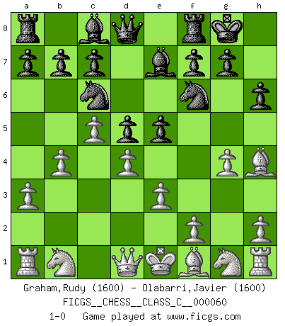 Last move : 1-0 2007 November 14 19:13:46 [Event "FICGS__CHESS__CLASS_C__000060"] [Site "FICGS"] [Date "2007.09.27"] [Round "1"] [White "Graham,Rudy"] [Black "Olabarri,Javier"] [Result "1-0"] [WhiteElo "1600"] [BlackElo "1600"] 1.c4 Nf6 2.a3 e6 3.d4 d5 4.c5 Nc6 5.Bg5 h6 6.Bh4 Be7 7.e3 O-O 8.g4 e5 9.b4 1-0 This chess game has been lost on time (started : 2007.09.27 16:59:43) English, 1...Nf6 (Anglo-Indian defense) Kingside Castling by player Black (move 7) Player White won this chess game. Follow this game move after move (download)Chess teaches you to control the initial excitement you feel when you see something that looks good and it trains you to think objectively when you're in trouble. (Stanley Kubrick) Wenn Capablanka heute auf der Schachbühne erscheinen würde, hätte er ein halbes Jahr gebraucht um sich die Schachtheorie anzueignen. Und dann hätte er alles und jeden besiegt. (Mikhail Moiseyevich Botvinik) En el Ajedrez, cuando menos, el valiente hereda la tierra. (Edmar Mednis) Aidez vos pièces, elles vous aideront. (Paul Morphy) There are two kinds of people in the world, my friend. Those who have a loaded gun and those who dig. You dig ! (Blondie in The Good, The Bad and The Ugly)