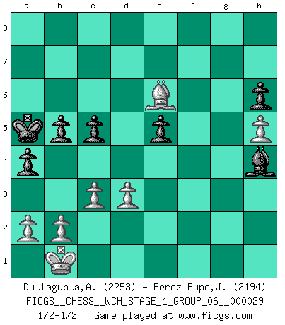 Last move : 1/2-1/2 2025 April 12 8:34:58 [Event "FICGS__CHESS__WCH_STAGE_1_GROUP_06__000029"] [Site "FICGS"] [Date "2025.02.02"] [Round "1"] [White "Duttagupta,Aniruddha"] [Black "Perez Pupo,Juan Rafael"] [Result "1/2-1/2"] [WhiteElo "2253"] [BlackElo "2194"] 1.e4 c6 2.Nc3 d5 3.Nf3 dxe4 4.Nxe4 Nf6 5.Qe2 Nxe4 6.Qxe4 Qd5 7.Qh4 Qf5 8.d3 Qg4 9.Qxg4 Bxg4 10.Be2 Nd7 11.h3 Bxf3 12.Bxf3 Ne5 13.Be2 e6 14.Bd2 a5 15.O-O-O Ng6 16.Kb1 Bc5 17.f4 Ne7 18.g4 g6 19.Bf3 Bd4 20.c3 Bf6 21.Rhf1 a4 22.Be4 Nc8 23.f5 gxf5 24.gxf5 e5 25.Bh6 Kd7 26.Rg1 Nd6 27.Kc2 b5 28.Rg4 Rab8 29.Be3 Kc7 30.Bc5 Nb7 31.Ba7 Rbd8 32.Bf3 h6 33.R4g1 Nd6 34.Bh5 Bg5 35.Bc5 Nxf5 36.Rdf1 Bf4 37.Bxf7 Rhf8 38.Be6 Ne3+ 39.Bxe3 Bxe3 40.Rg7+ Kb6 41.Rxf8 Rxf8 42.Rf7 Rxf7 43.Bxf7 c5 44.h4 Ka5 45.h5 Bg5 46.Be6 Bd8 47.Kb1 Bh4 1/2-1/2 Follow this game move after move (download)In Chess, as it is played by masters, chance is practically eliminated. (Emanuel Lasker) Meine Liebe ist Schach, Schach, Schach. Ich muss jeden Tag Schach spielen, deshalb fühle ich mich so stark. (Miguel Najdorf) Sin errores no puede haber brillantez. (Emanuel Lasker) Vous savez, camarade Pachman, je n'éprouve pas de plaisir à être ministre, je jouerais plutôt aux échecs comme vous, ou alors ferais une révolution au Venezuela. (Che Guevara à Ludek Pachman, 'Checkmate in Prague', 1975) Everybody lies. (Gregory House, House M.D.)